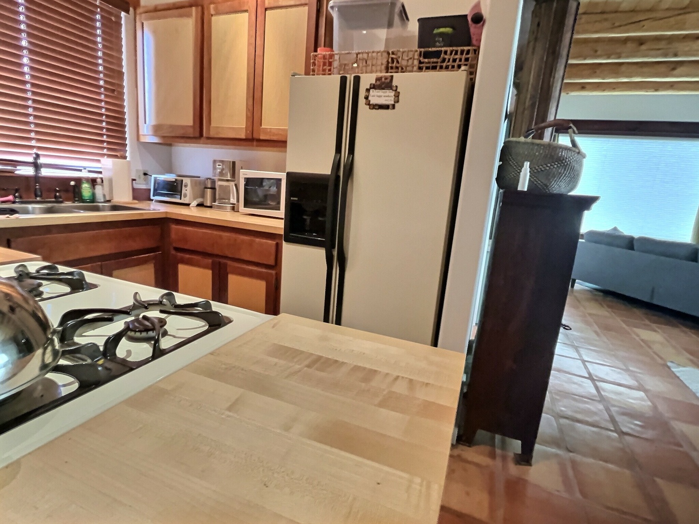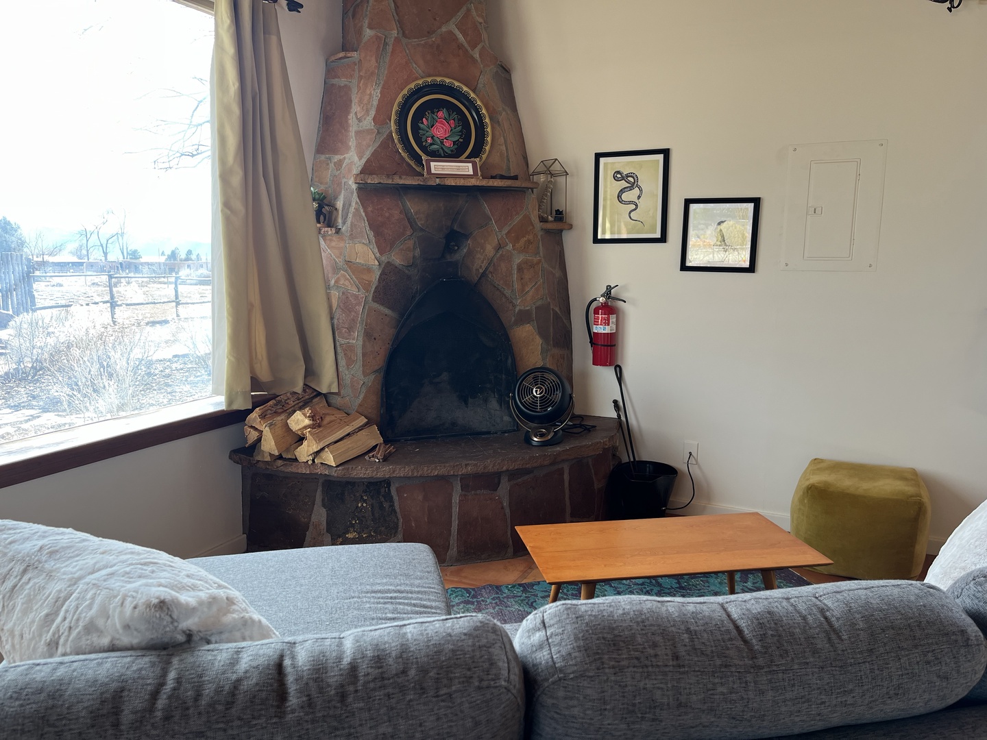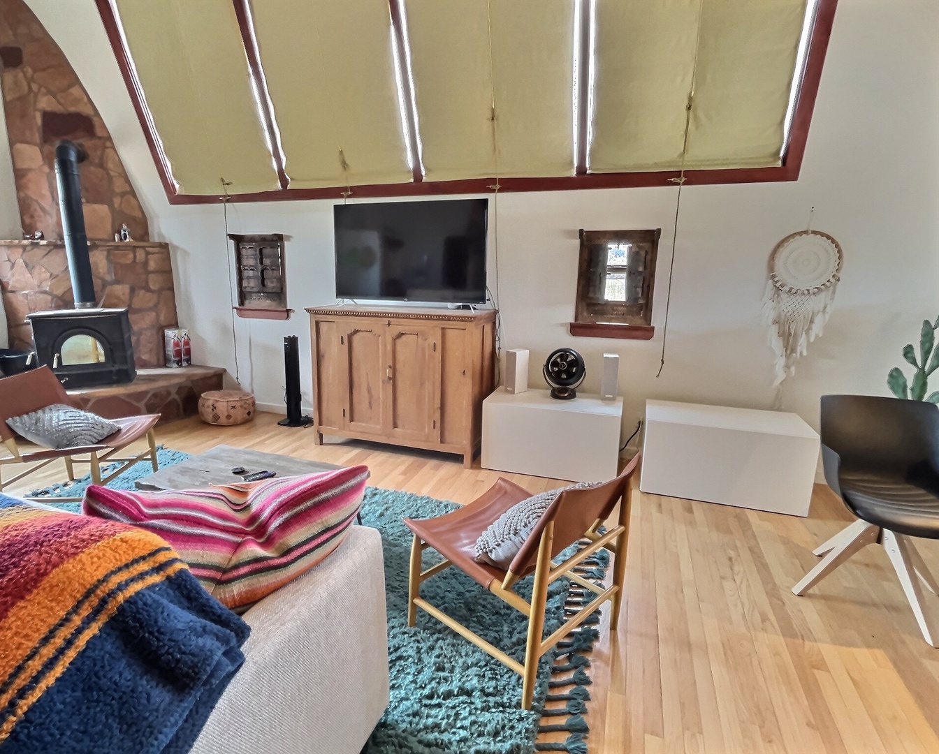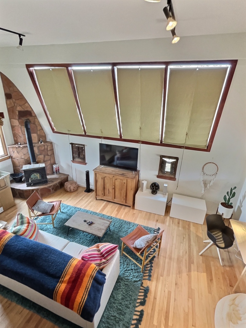 Upstairs loft with queen bed is reachable only by a spiral staircase, so plan accordingly as the spiral staircase is not safe for young children. In the back side of the home is a full kitchen, large dining area, queen sleeping space with privacy curtain, sofa and fireplace, and a full bathroom with tub.