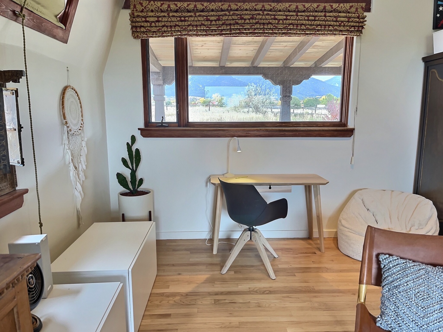 Cozy Entertainment area with large flat screen TV, fireplace, work desk