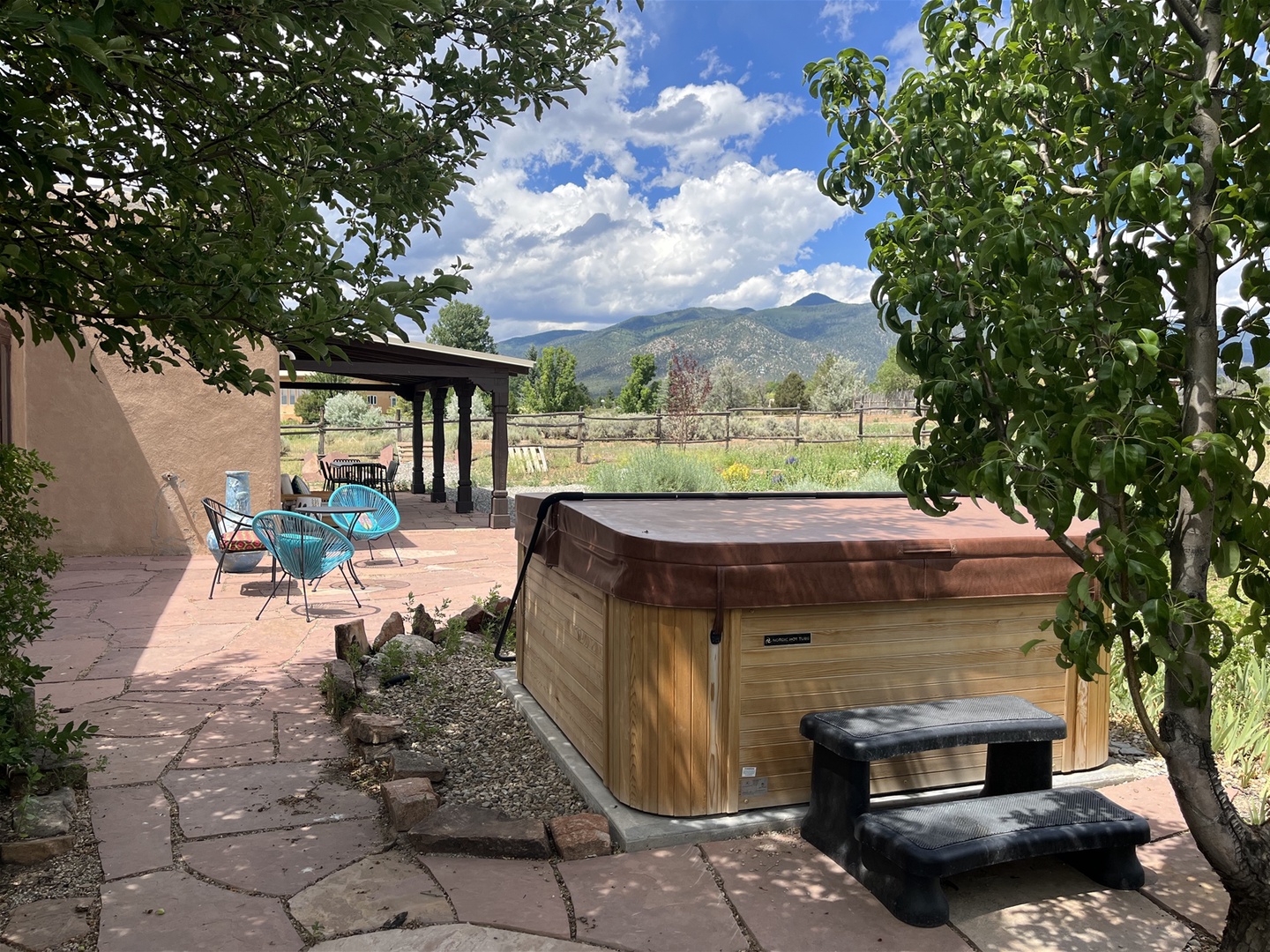 The exterior features a large flagstone patio with sturdy patio furniture, gorgeous hot tub, covered portal and landscaped yard. The entry porch is stone and soaks up the sun in the afternoon so it's a great late day sitting porch, especially in fall and winter.