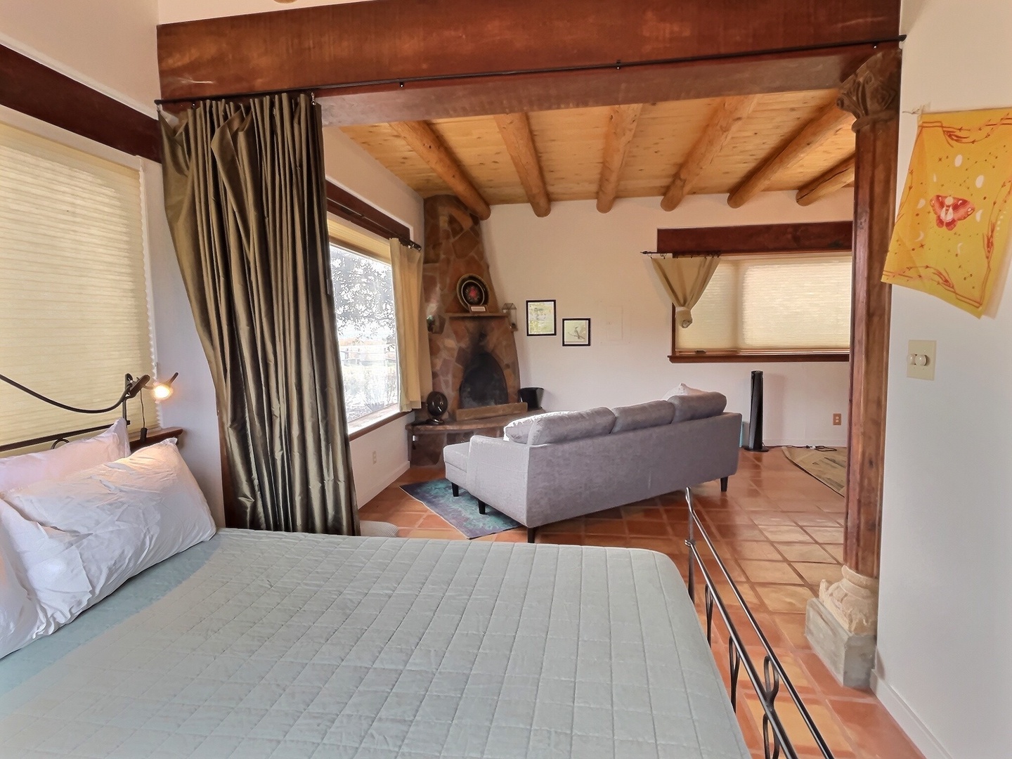 Newly furnished custom home is comfortable, private and well-appointed. Open floor plan means guests should all be comfortable with one another as the only doors in the house are for entry/exit and on the two bathrooms, or to separate two distinct living areas with bedroom using a set of large wooden doors.