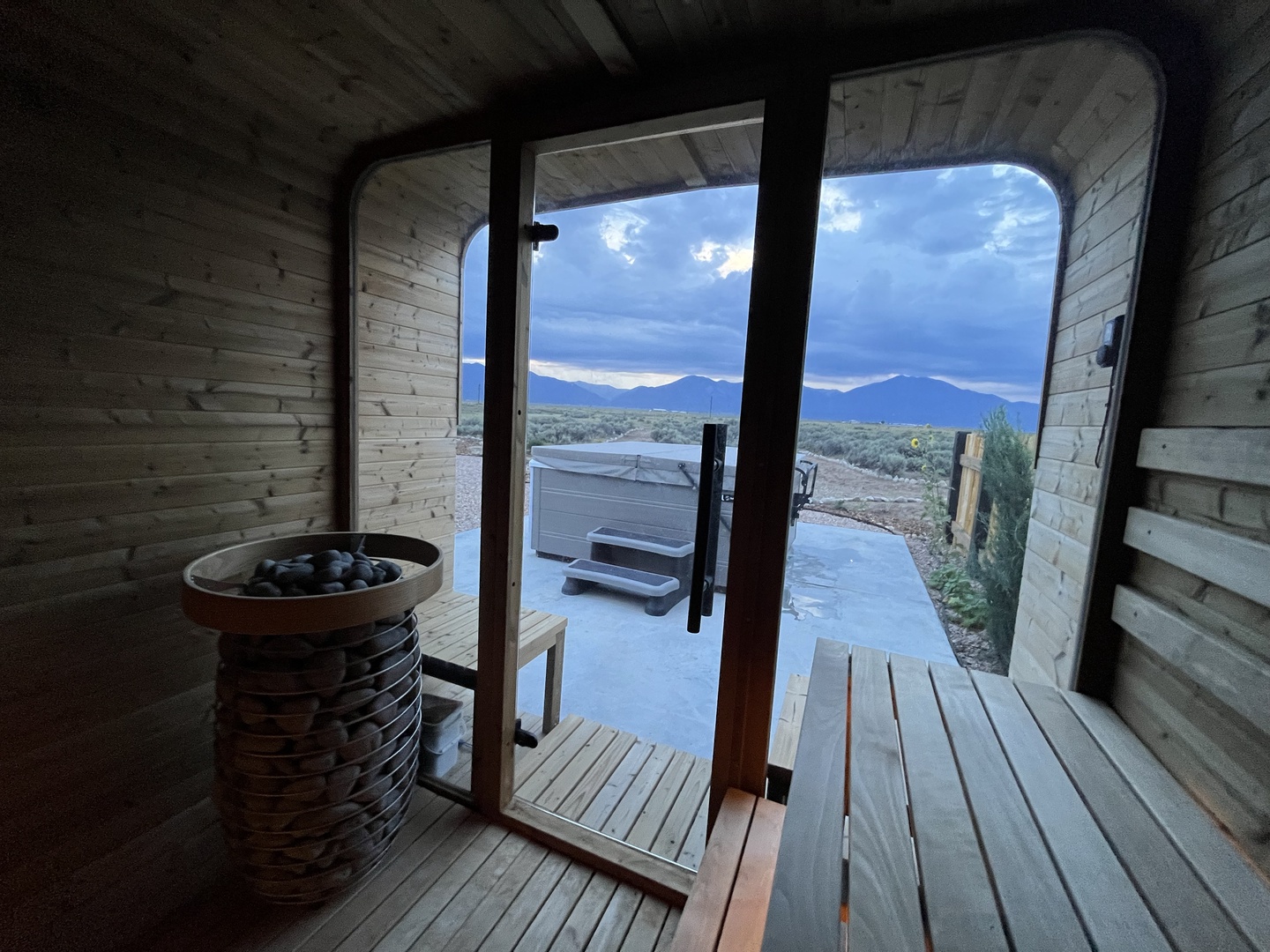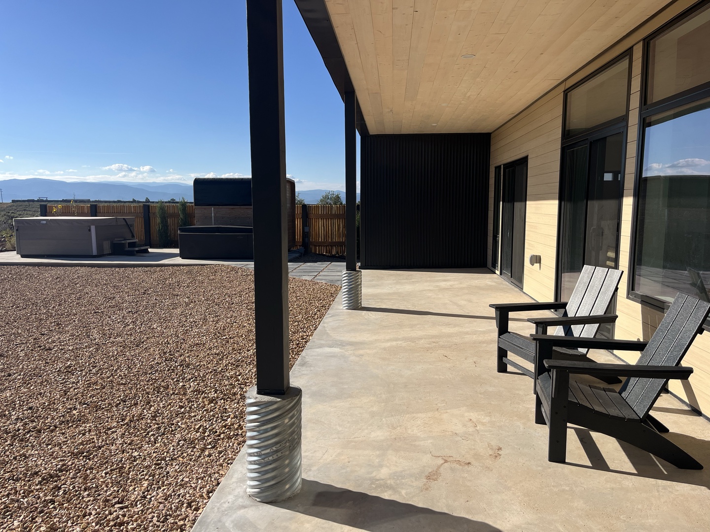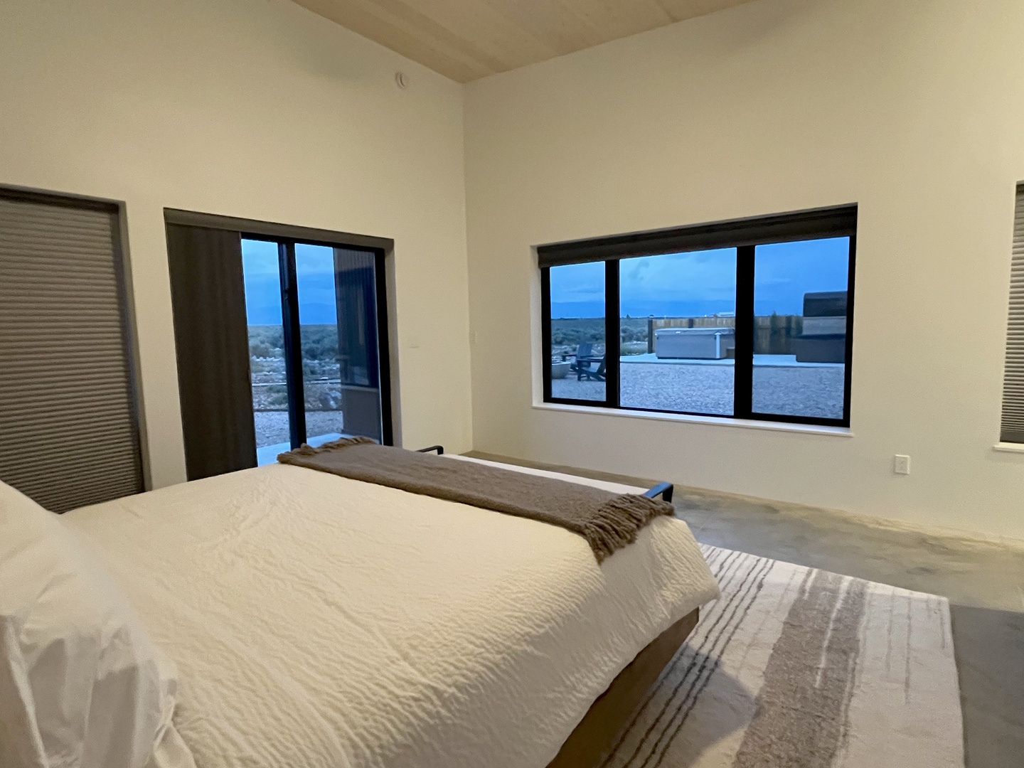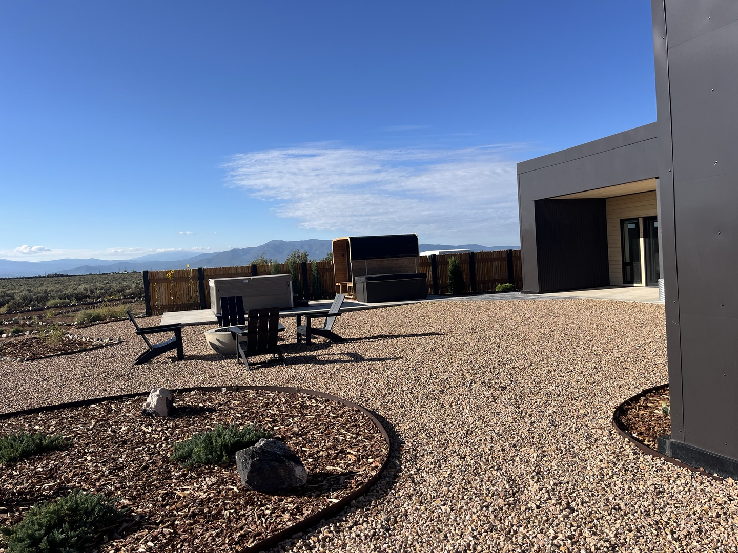 Casa de Luz is a heart melting three bedroom, three bathroom home with modern open concept living dining and kitchen space designed with love and care to let guests relax to the fullest with private indoor outdoor living. Outdoor features include a beautifully landscaped patio with 6 person hot tub, sauna, and cold plunge pool, outdoor shower, Adirondack chair seating and gas fire pit all very private thanks to the design of the home and fence wrapping around the outdoor areas, but open to the mesa and the mountains to the north. Indoor amenities include mini split air conditioning units in the living area and each bedroom. Comfortable livingroom with Samsung Frame TV, fireplace controlled with a light switch, and comfortable furnishings. Casa de Luz offers a well stocked kitchen and dining area for entertaining and large sliding glass doors and screens that open out to the patio create a wonderful indoor/outdoor flow.