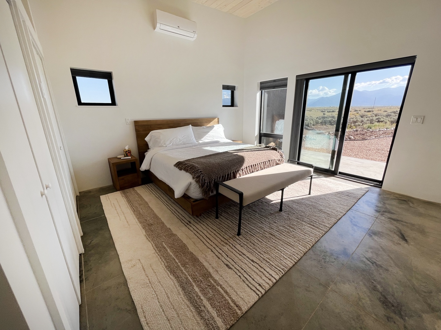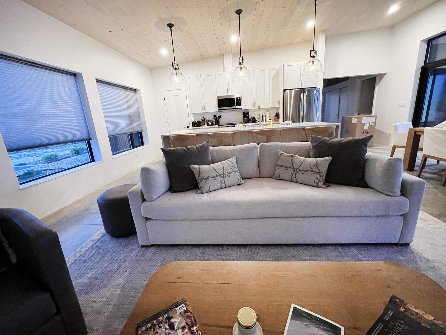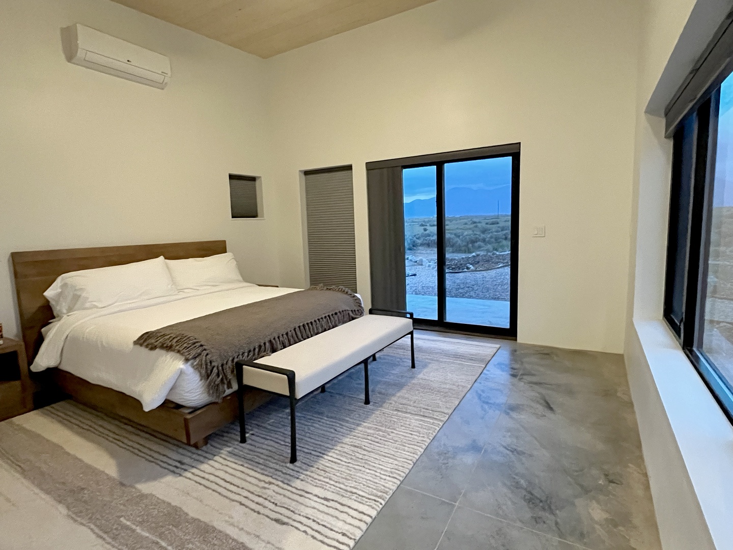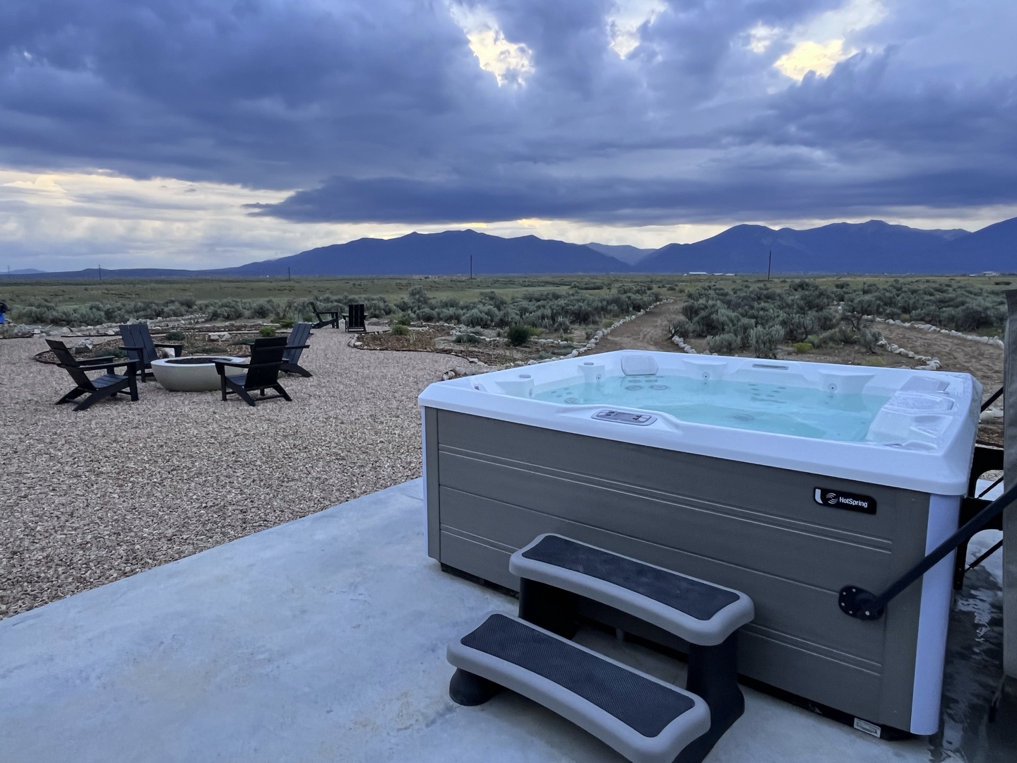 Casa de Luz is a heart melting three bedroom, three bathroom home with modern open concept living dining and kitchen space designed with love and care to let guests relax to the fullest with private indoor outdoor living. Outdoor features include a beautifully landscaped patio with 6 person hot tub, sauna, and cold plunge pool, outdoor shower, Adirondack chair seating and gas fire pit all very private thanks to the design of the home and fence wrapping around the outdoor areas, but open to the mesa and the mountains to the north. Indoor amenities include mini split air conditioning units in the living area and each bedroom. Comfortable livingroom with Samsung Frame TV, fireplace controlled with a light switch, and comfortable furnishings. Casa de Luz offers a well stocked kitchen and dining area for entertaining and large sliding glass doors and screens that open out to the patio create a wonderful indoor/outdoor flow.
