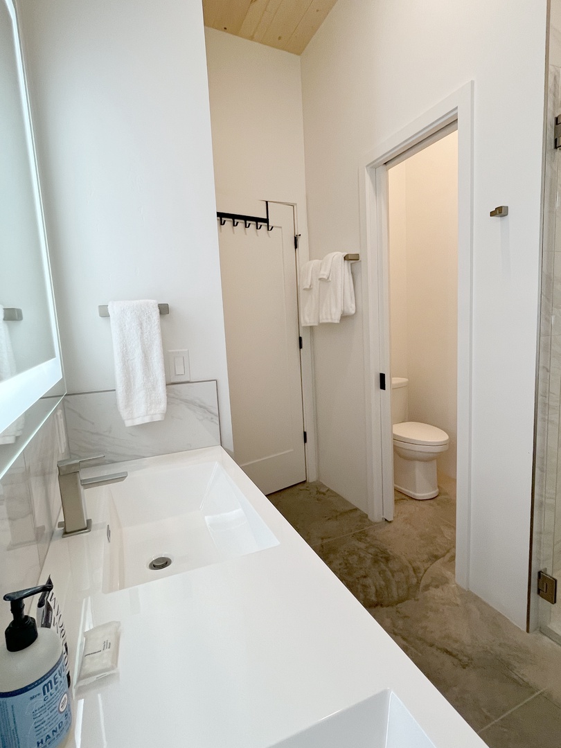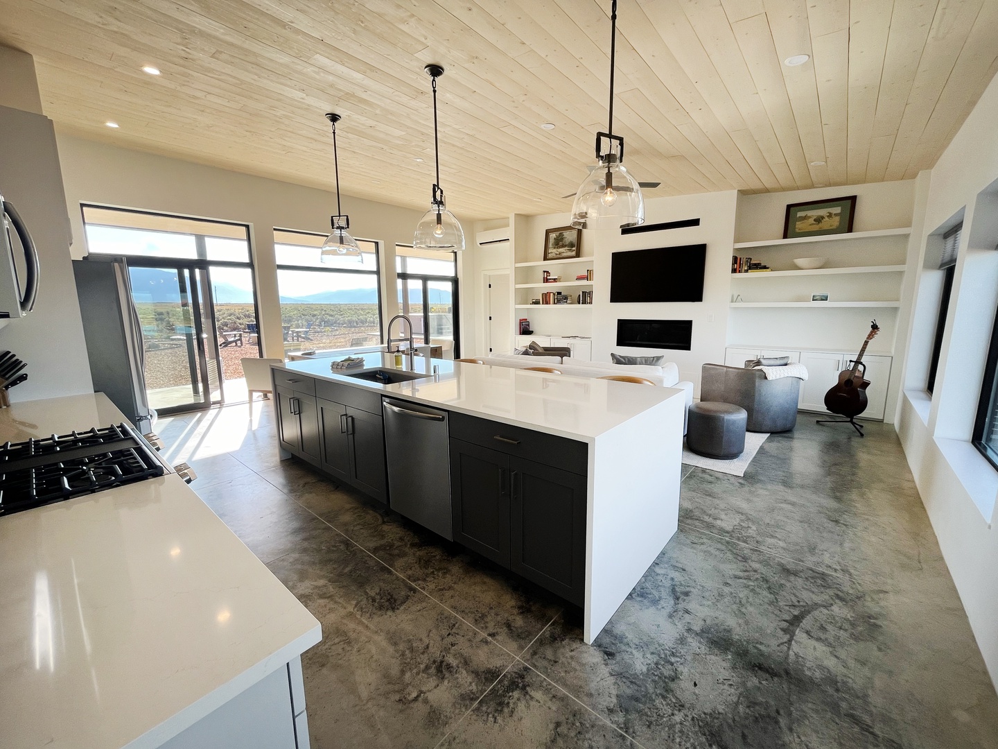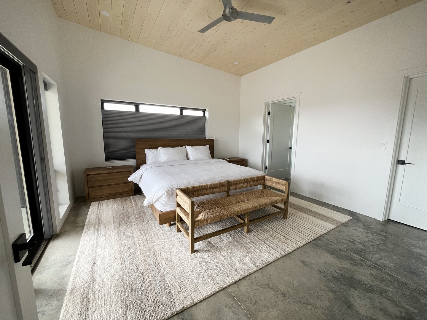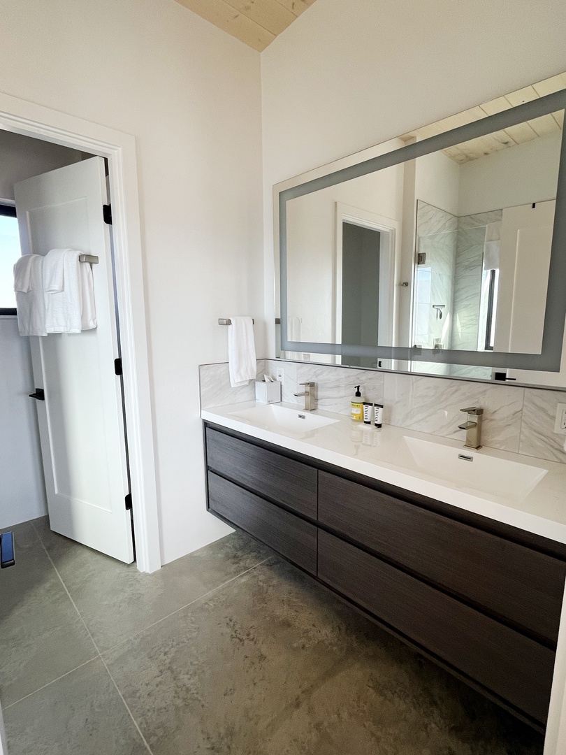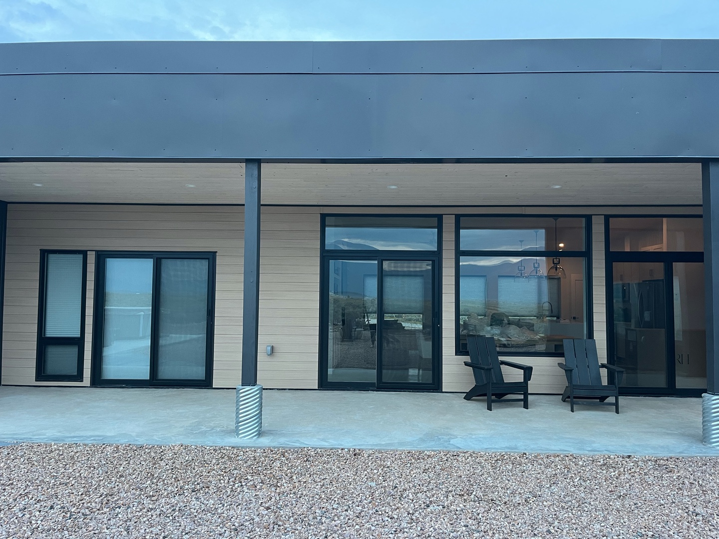 Casa de Luz is a heart melting three bedroom, three bathroom home with modern open concept living dining and kitchen space designed with love and care to let guests relax to the fullest with private indoor outdoor living. Outdoor features include a beautifully landscaped patio with 6 person hot tub, sauna, and cold plunge pool, outdoor shower, Adirondack chair seating and gas fire pit all very private thanks to the design of the home and fence wrapping around the outdoor areas, but open to the mesa and the mountains to the north. Indoor amenities include mini split air conditioning units in the living area and each bedroom. Comfortable livingroom with Samsung Frame TV, fireplace controlled with a light switch, and comfortable furnishings. Casa de Luz offers a well stocked kitchen and dining area for entertaining and large sliding glass doors and screens that open out to the patio create a wonderful indoor/outdoor flow.