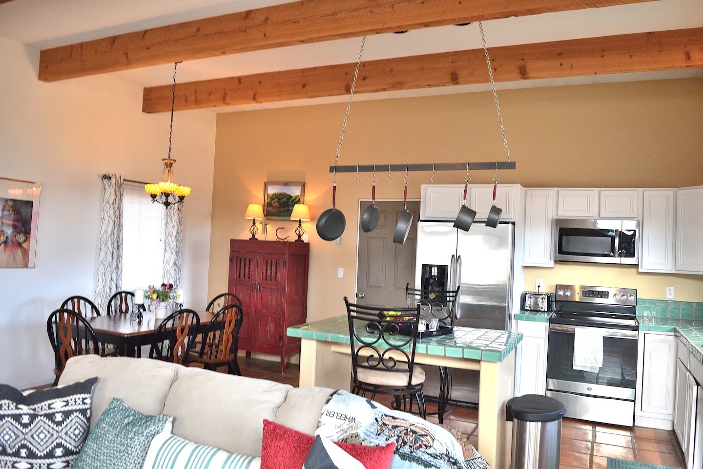 The downstairs bedroom has one king bed, the downstairs bathroom has a deep soaking tub. The living room has a regular sofa and a queen sleeper sofa and smart TV with Roku. Casa de Sierra's kitchen is fully equipped with everything you should need to cook and prepare meals and all the appliances are newer.
