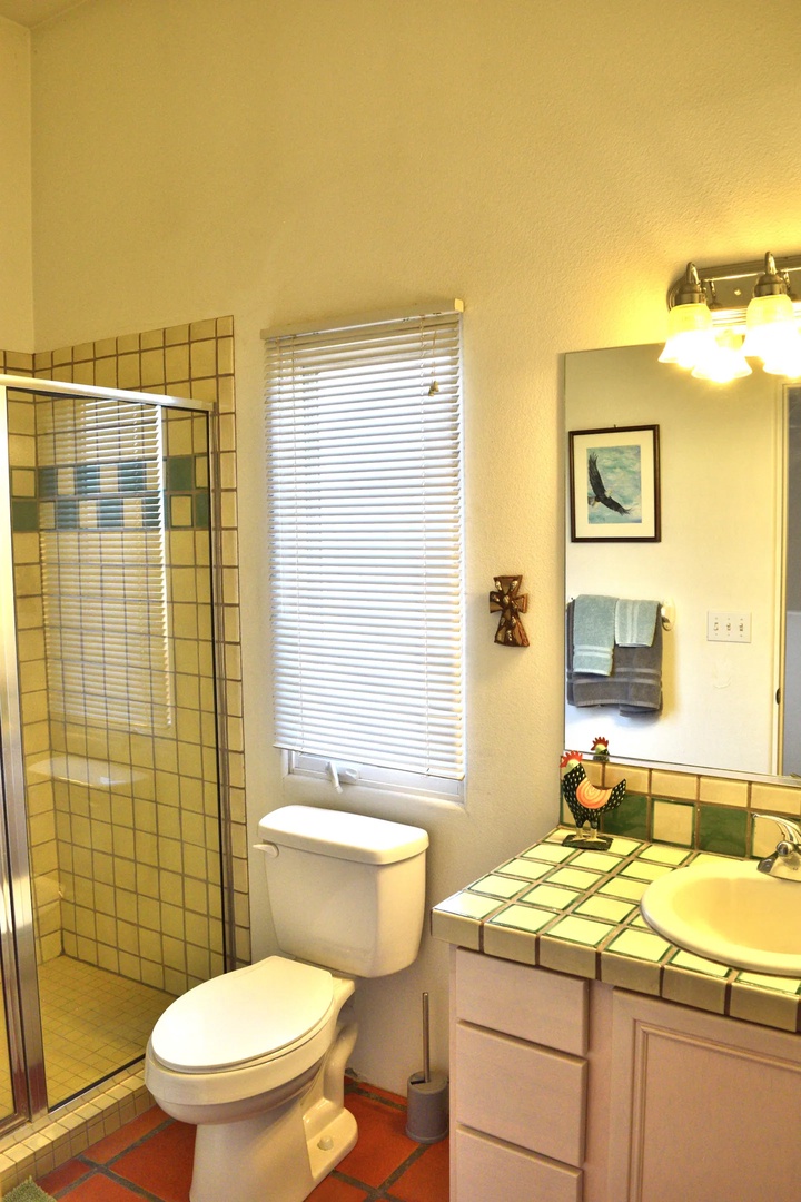 There is an enclosed patio on the east side of the home facing the mountains. The patio is shaded in the afternoon for comfortable outside seating. There is a charcoal BBQ located in this patio. Upstairs, find the second bedroom, full bathroom with shower, and the upstairs balcony facing east. There is a washer/dryer with laundry soap provided. The one car garage is available for guest use.