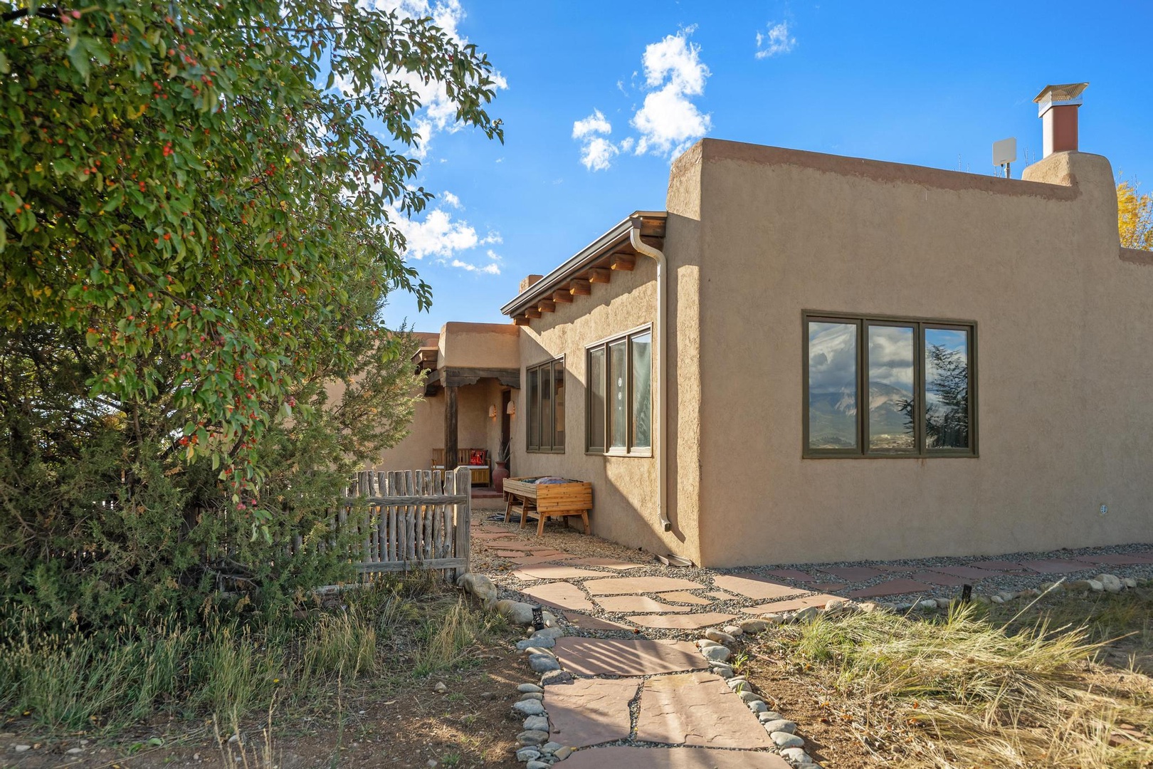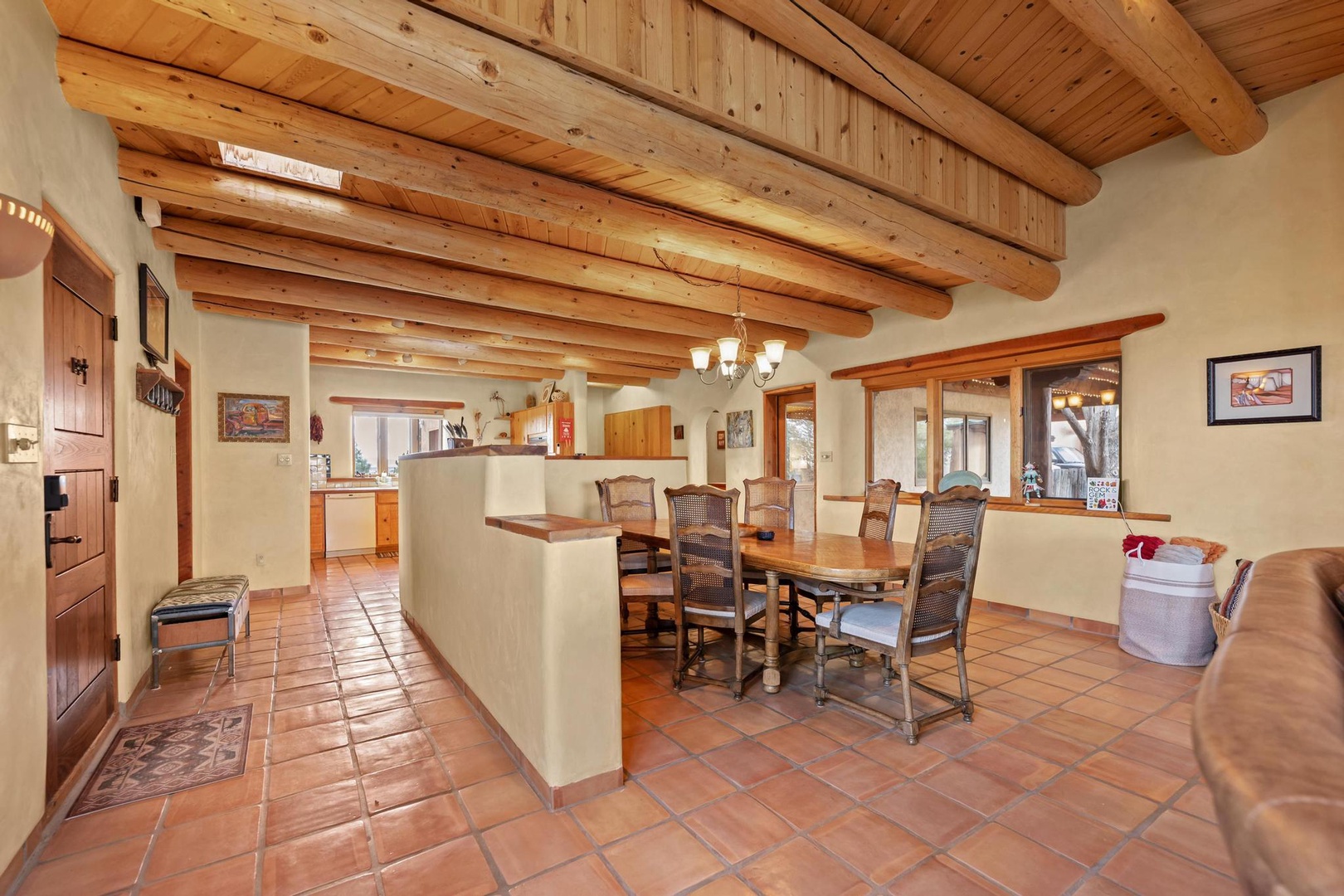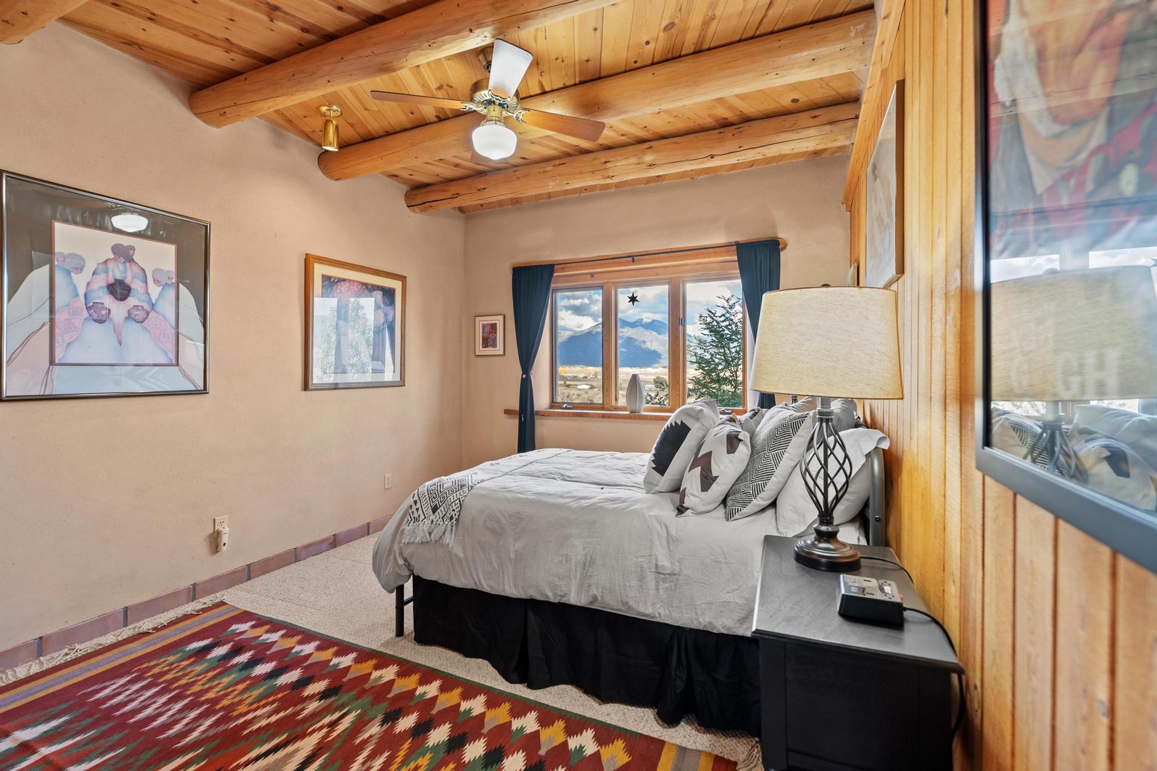 The well-stocked kitchen and adjacent dining room allow you to enjoy a home cooked meal after a day adventuring to the ski area (30 minutes away), the Taos Plaza (15 minutes away) or the Rio Grande Gorge (10 minutes away) or the many hiking trails in the area. You’ll find parking for 3 cars in front of the garage.