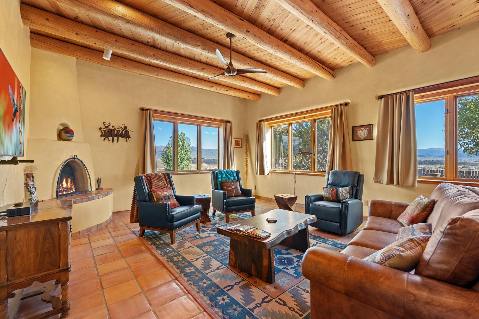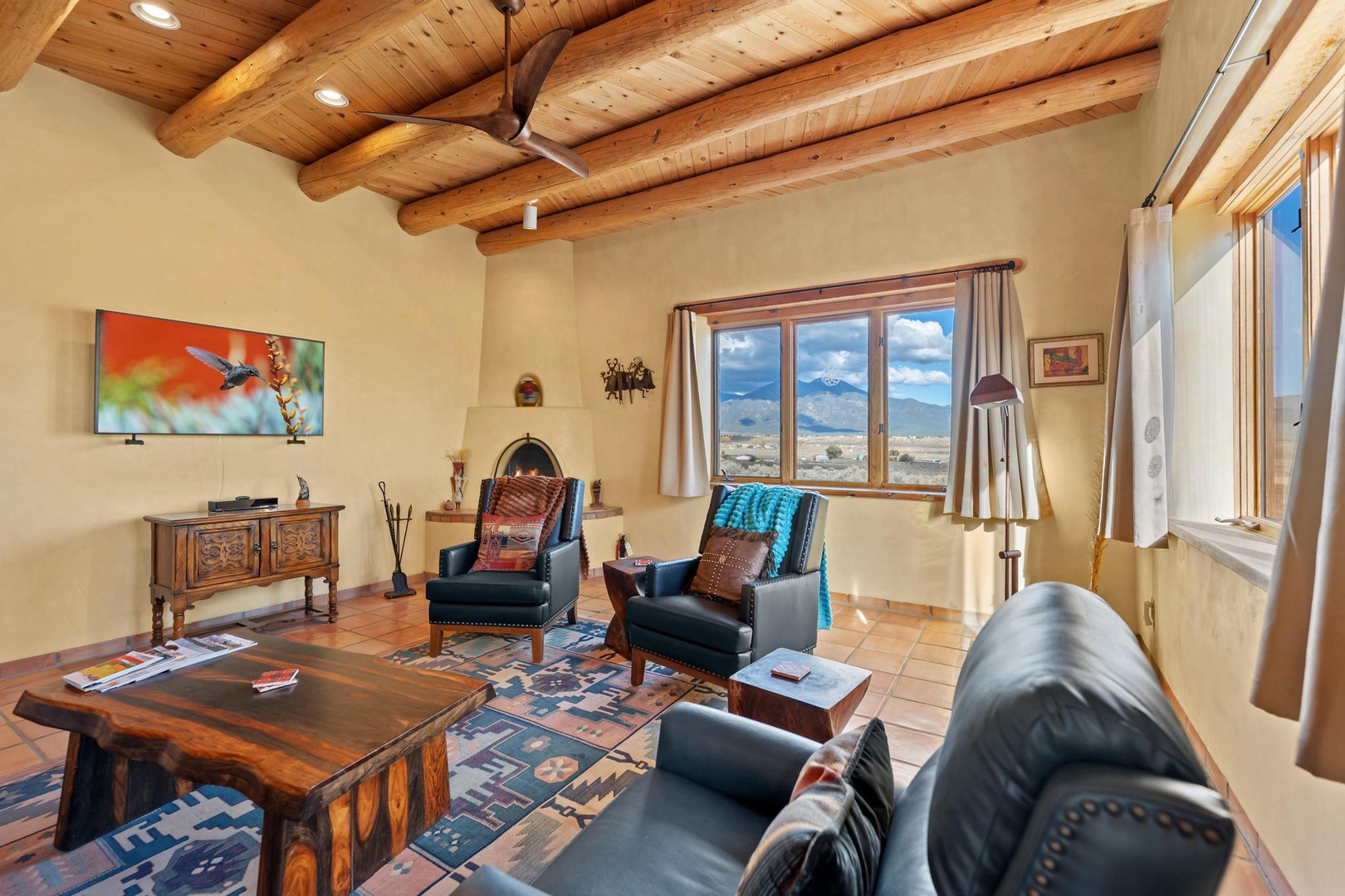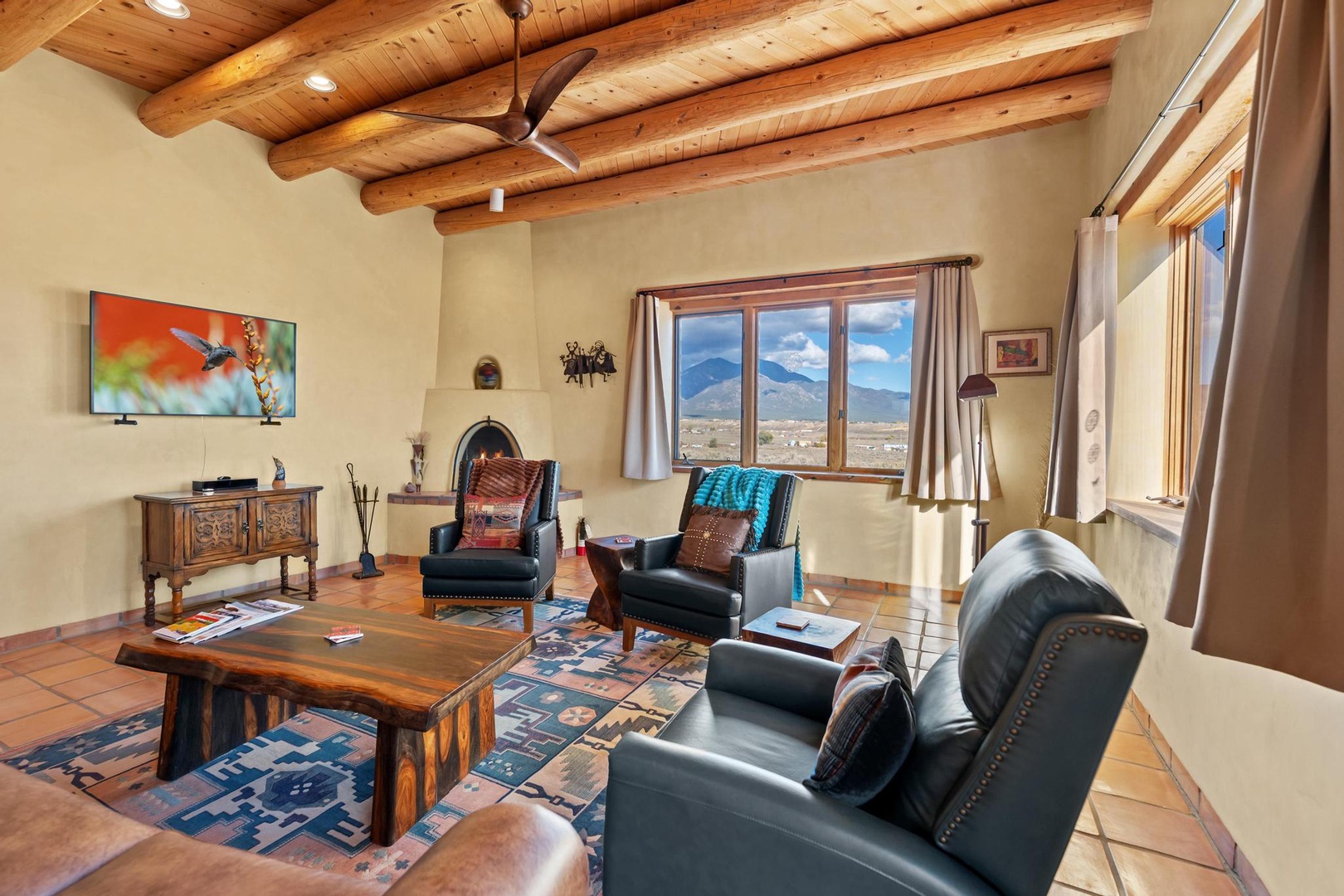 Sitting area in living toom with TV and kiva fireplace