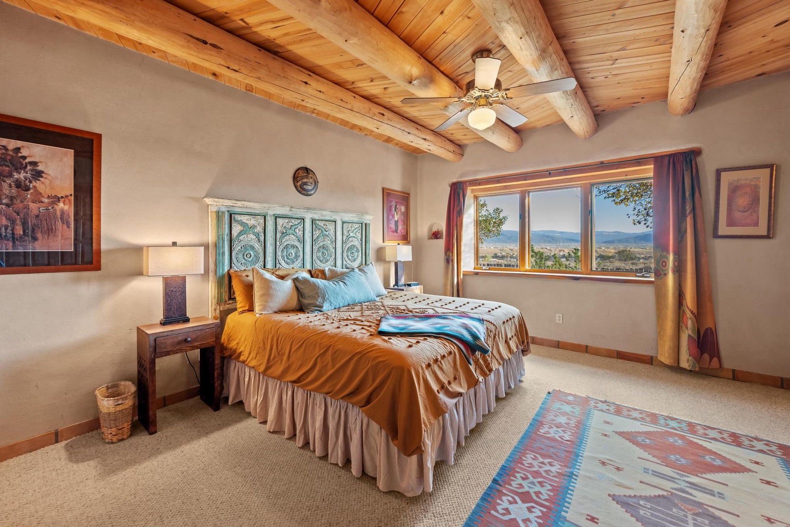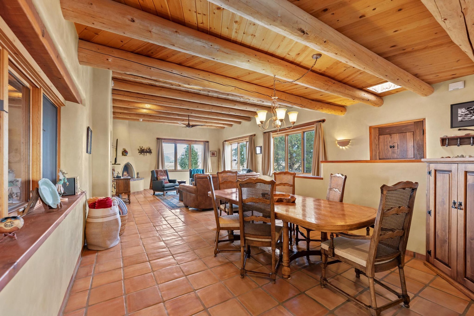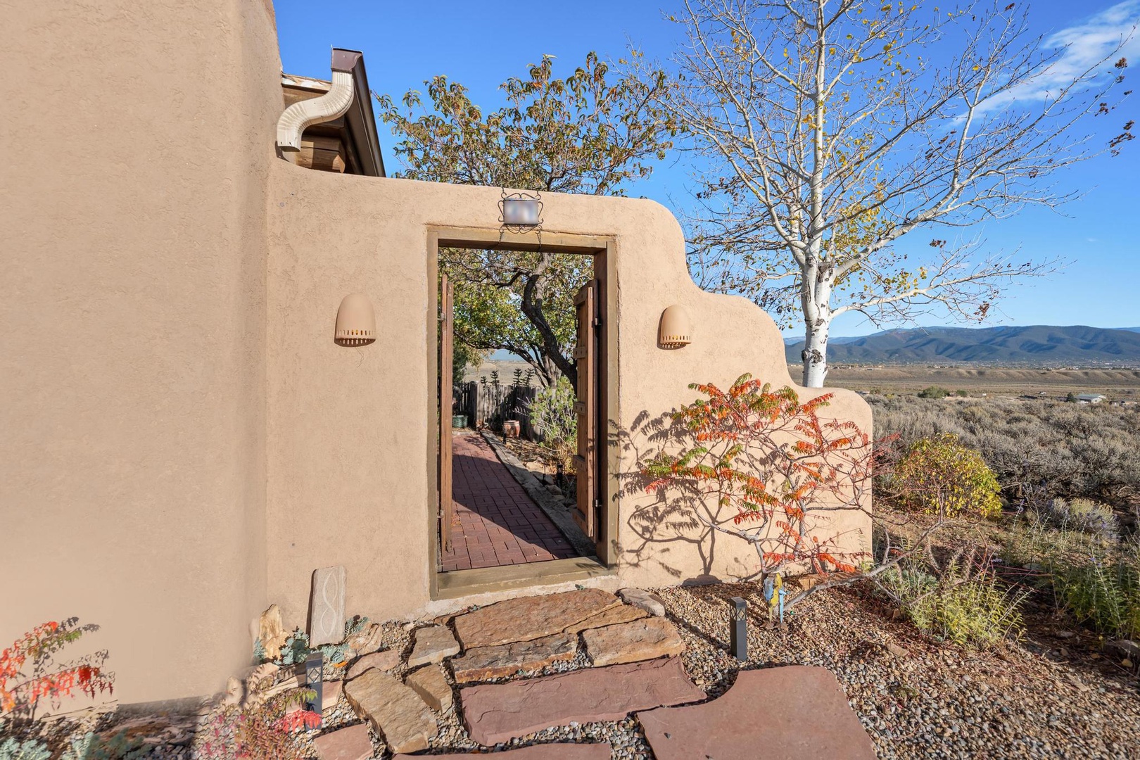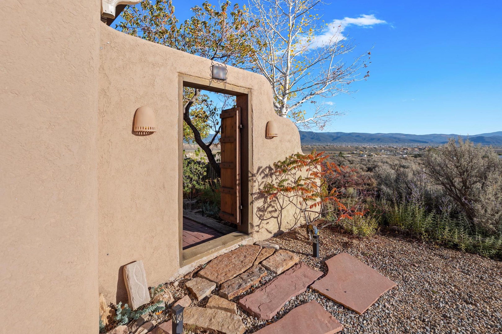Welcome to Endless Skies, our hilltop haven constructed of straw bale and adobe. Admire the authentic southwestern details including hand-hewn viga ceilings, kiva fireplace, walled front courtyard and hand painted Talavera tile.