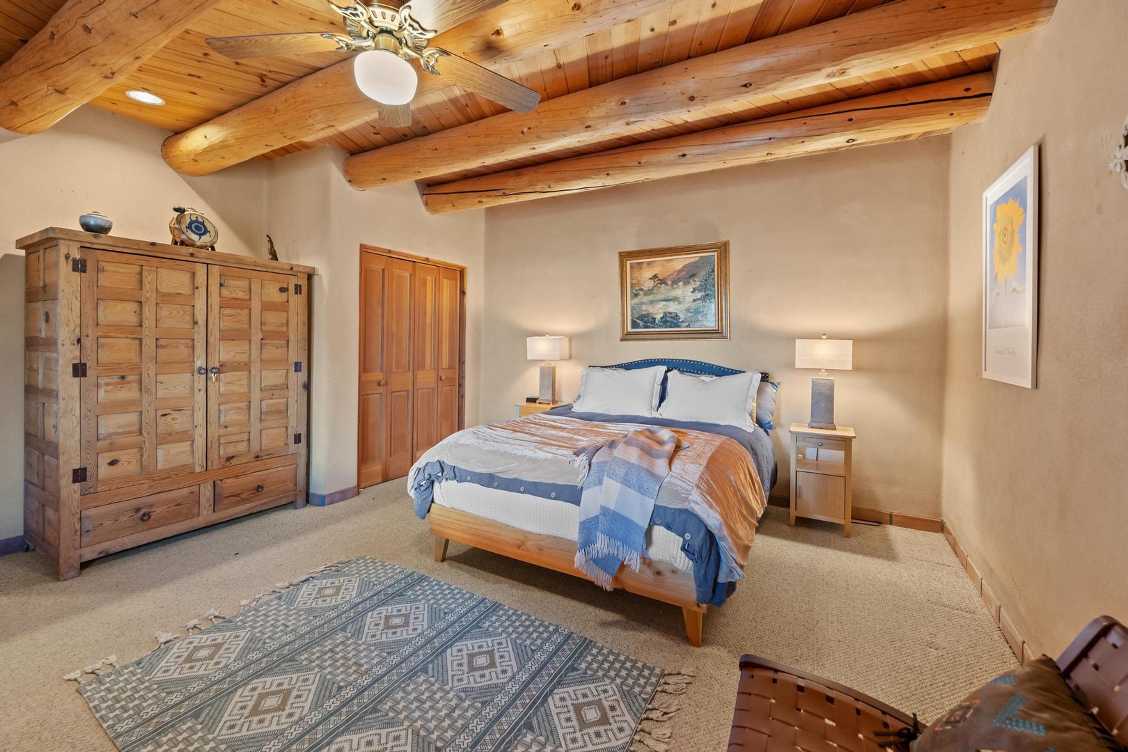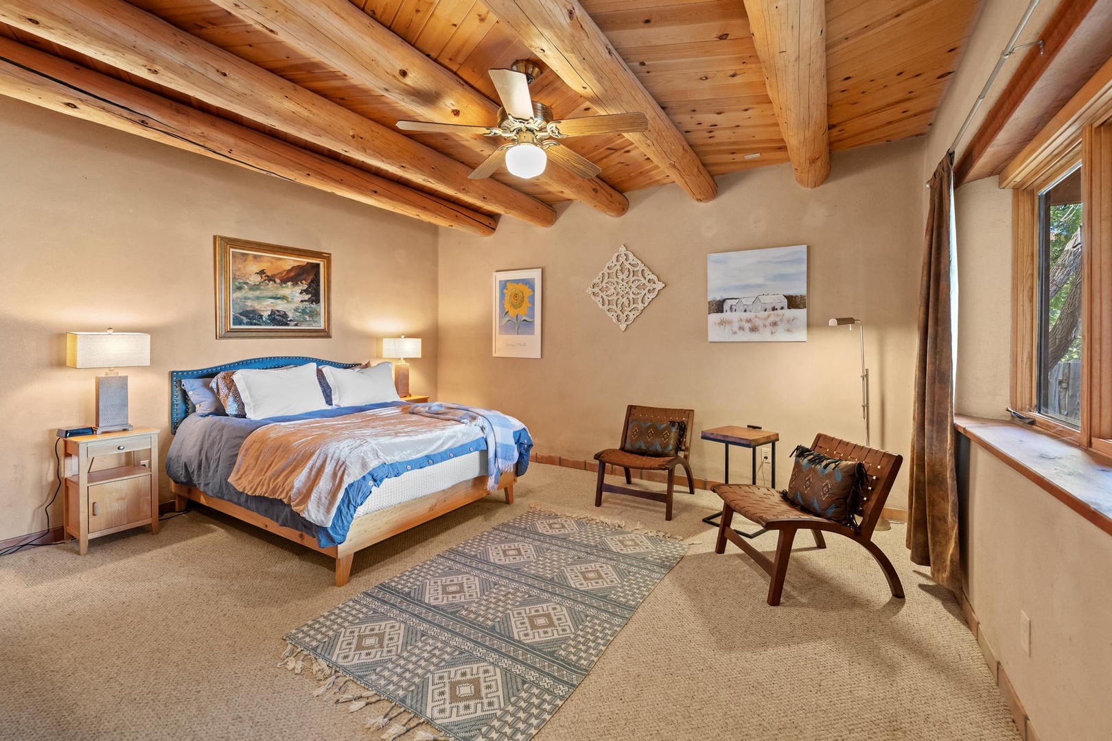 King primary bedroom off the kitchen with adobe plaster walls