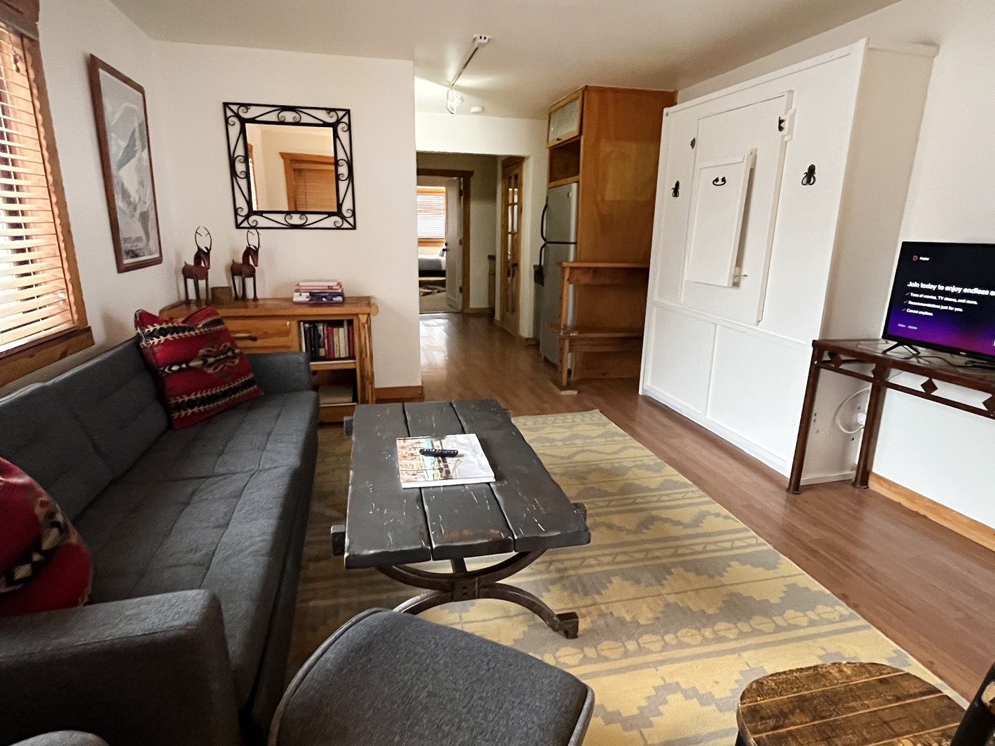 Ski right up to this condo's entry from Whitefeather. Enjoy modern amenities, two full bathrooms and an apartment kitchen with full sized fridge and dishwasher. Just above the world-famous Taos Ski Valley Ski School, the Rio Hondo Learning Center, up on the slopes, sits the Snow Bear at Taos Ski Valley. Come enjoy the cool, green summer and beautiful fall seasons with us, too. Reasonable rates put a slope-side vacation in reach for any family. Make your own meals in the fully equipped kitchen. Bring what you need - there is storage and refrigeration. Flatscreen TV and wifi for your subscription services provide the entertainment while mom and dad hit the town in downtown Taos Ski Valley just down the way. Master bedroom has a private entrance so you don't wake the kids. Front room murphy bed also converts for dining table. Great views of the Taos Ski Valley will keep you coming back for more. Snow Bear in the heart of Taos Ski Valley is known for cleanliness, proximity to all that is Taos. We are available to advise guests on trip planning and are around the property incase issues arise. 4 wheel drive is a must in Winter - the condos are really up on the mountain and we got a lot of snow. Once you are here you can ski everywhere you need to go (in Winter with coverage) or take the brand new gondola or beginner lift just a quick walk from our front door to the base area to enjoy the newly revamped Taos Ski Valley. In the summer, the resort is quieter, but the hiking, fishing and biking opportunities in the cool mountain air are tremendous.