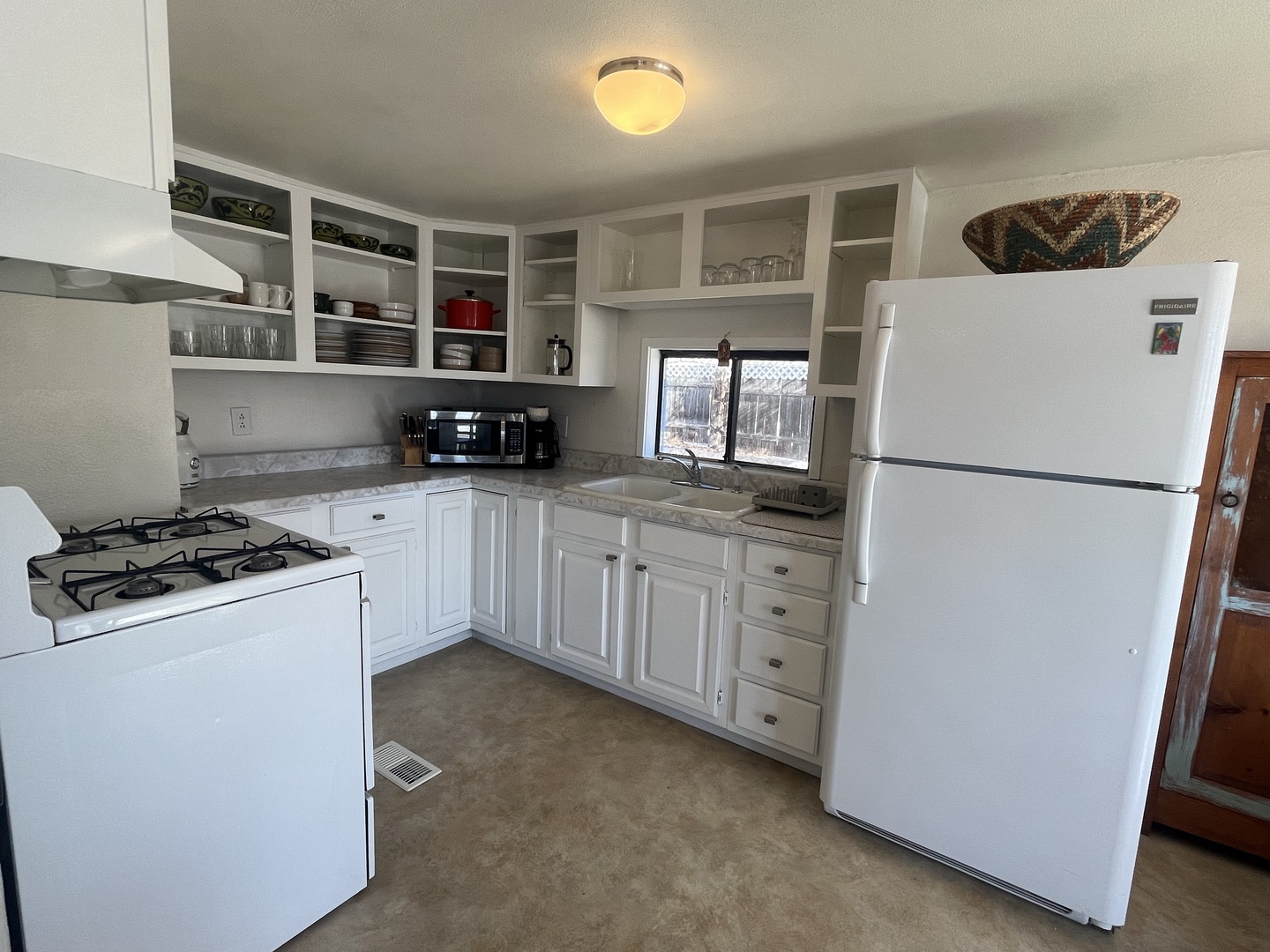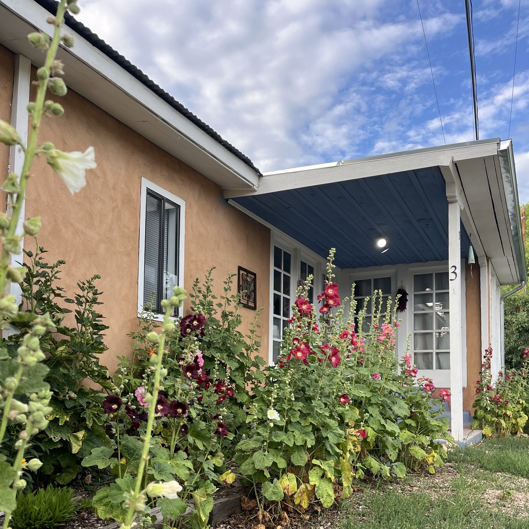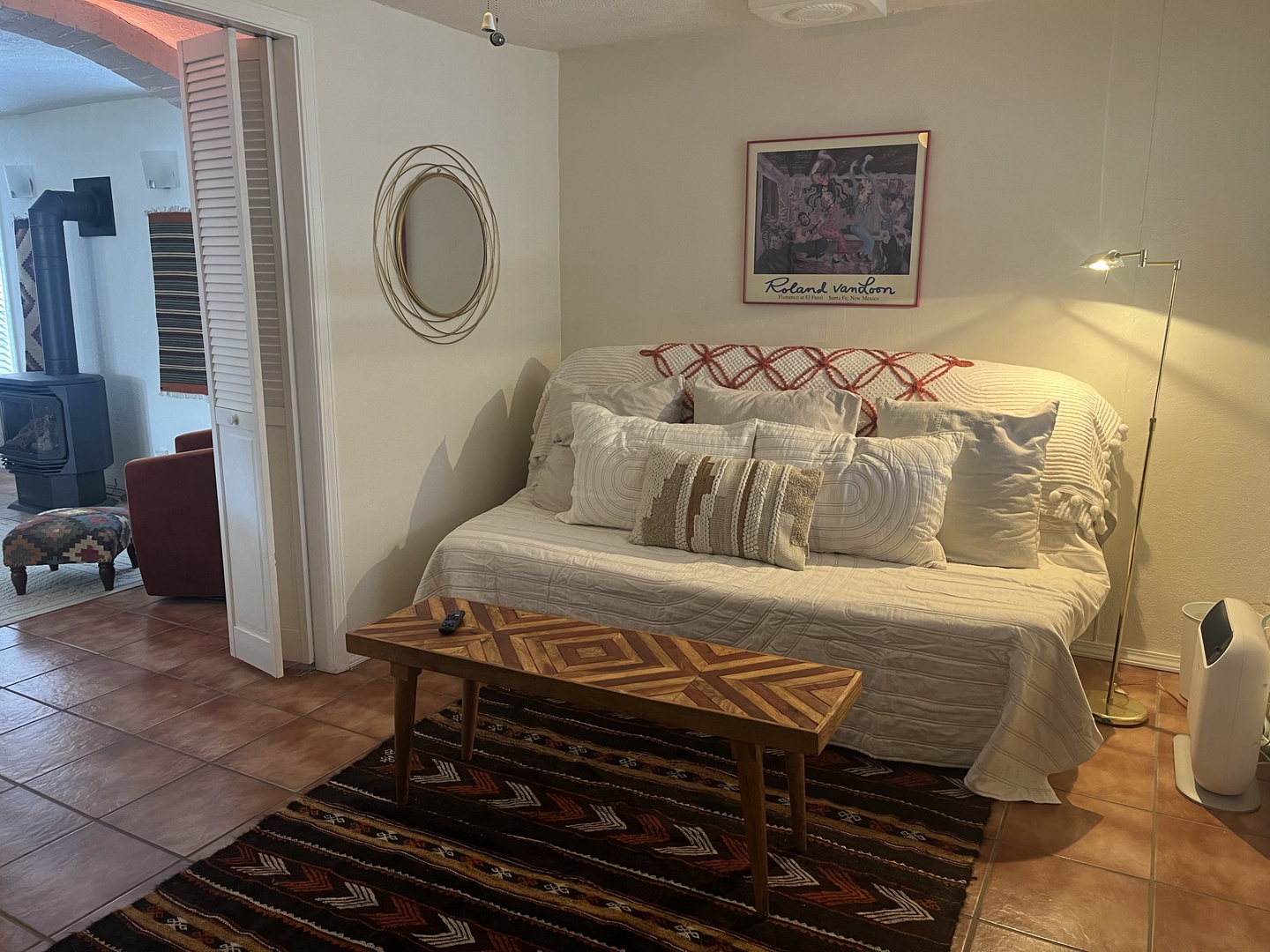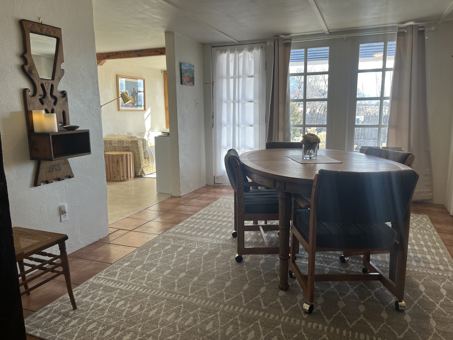 A sweet little place with lots of light and comfort, lovingly renovated and perfect for a carefree getaway in the heart of historic artisan village of Arroyo Seco. The home is comprised of one large primary bedroom with comfortable queen bed, a twin trundle bed room, and third sleeping space off the living area with a couch/full futon sleeping space and smart TV. There are two full hall baths, one wiht shower and the other with tub/shower combo. The spacious living room features a sectional sofa, coffee table, and two seats with footstools. The dining table seats 4 but there are two spare dining chairs in the futon room incase you need to seat a few more. The kitchen is simple, but well appointed and stocked for basic cooking and baking with a 4 burner gas stove and oven, microwave, drip and french press coffee makers, and full sized fridge. A full size washer and dryer fit neatly in a laundry closet. All needed kitchen, bath and laundry amenities are provided. The sun room area is just off the kitchen, and this is the perfect spot for sunny cat naps, cups of tea with a favorite read, or when you have to stay home and work on the computer while your mates are out playing in nature.