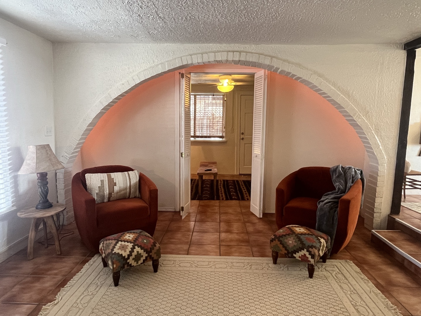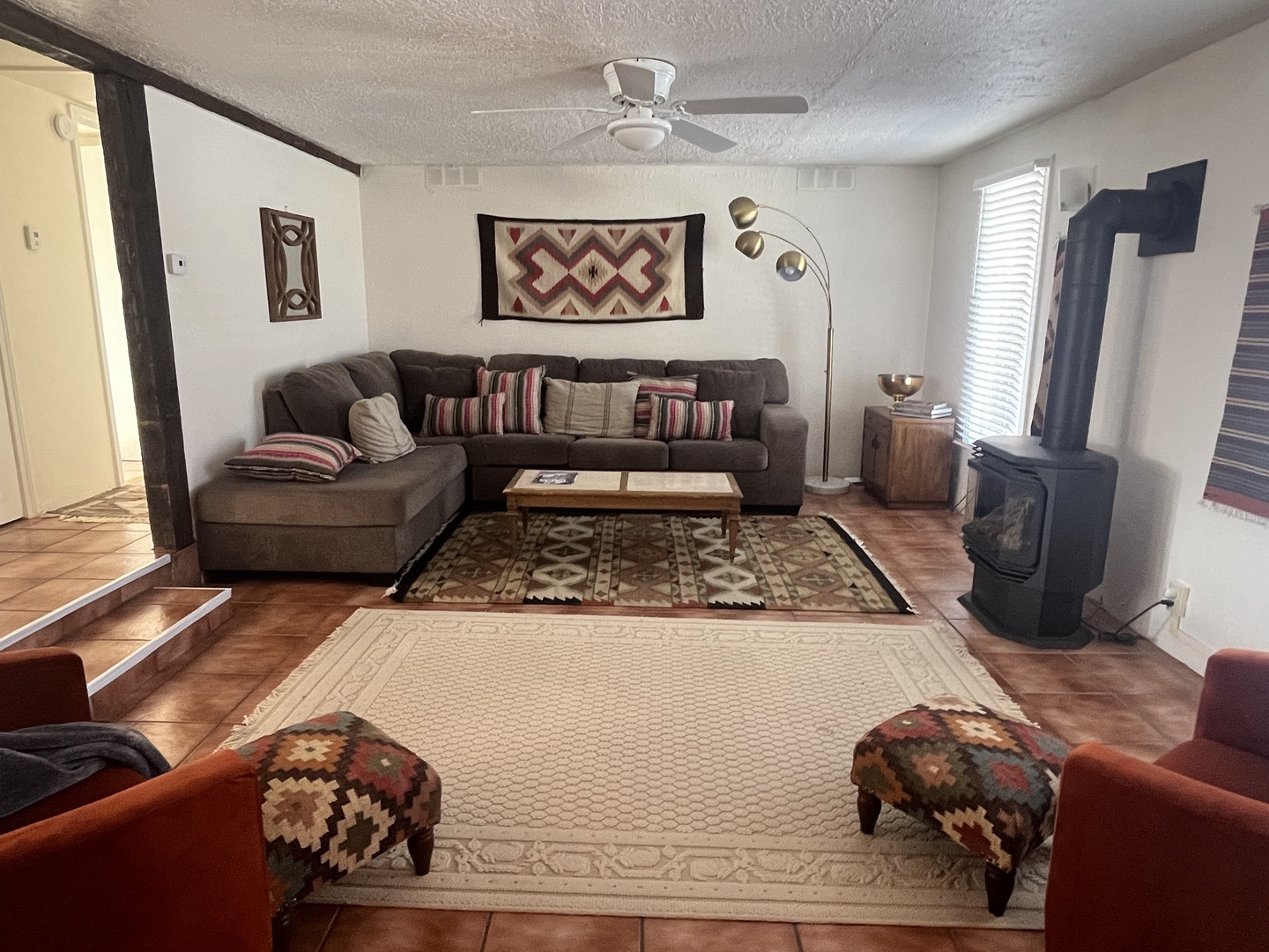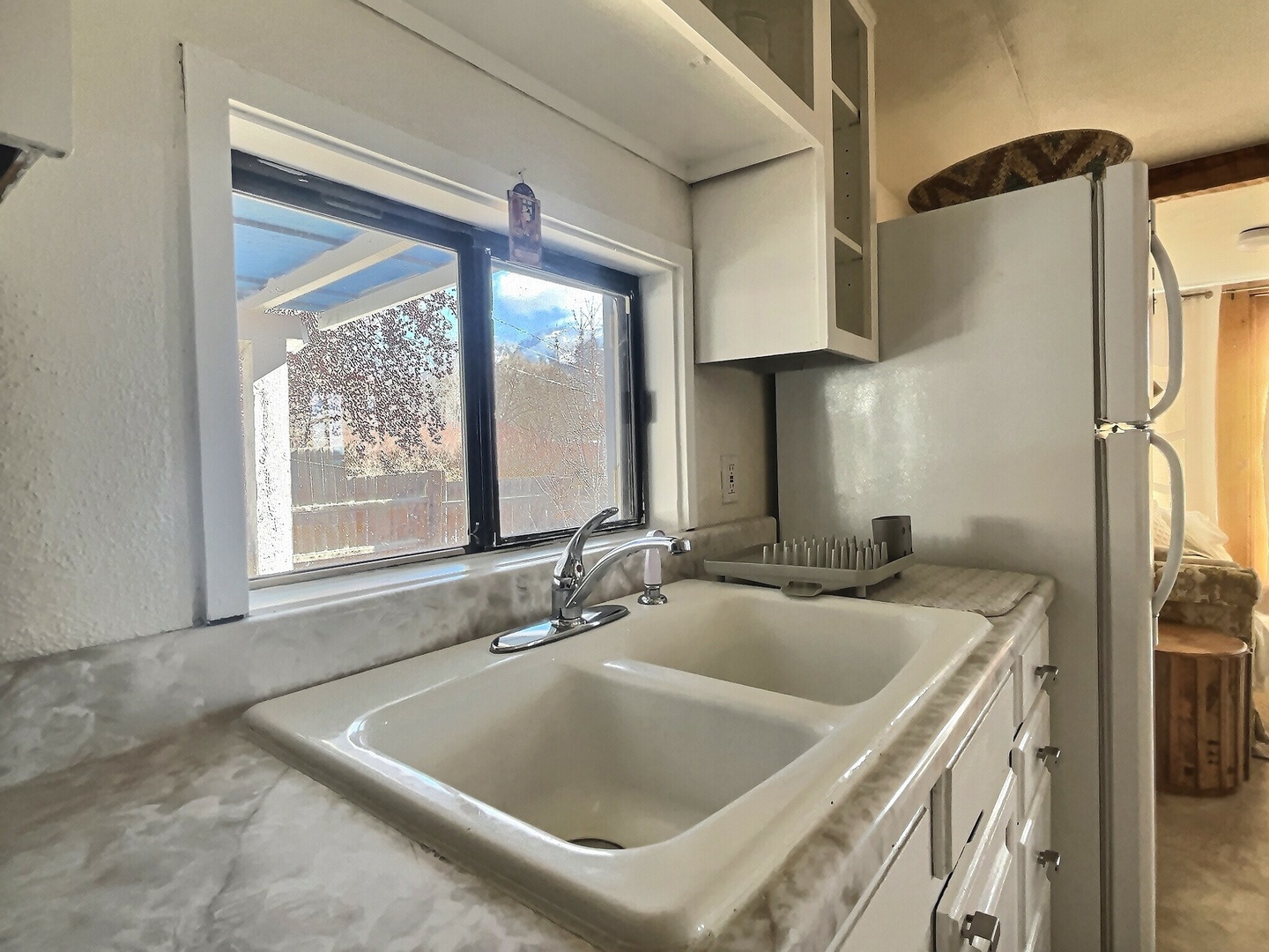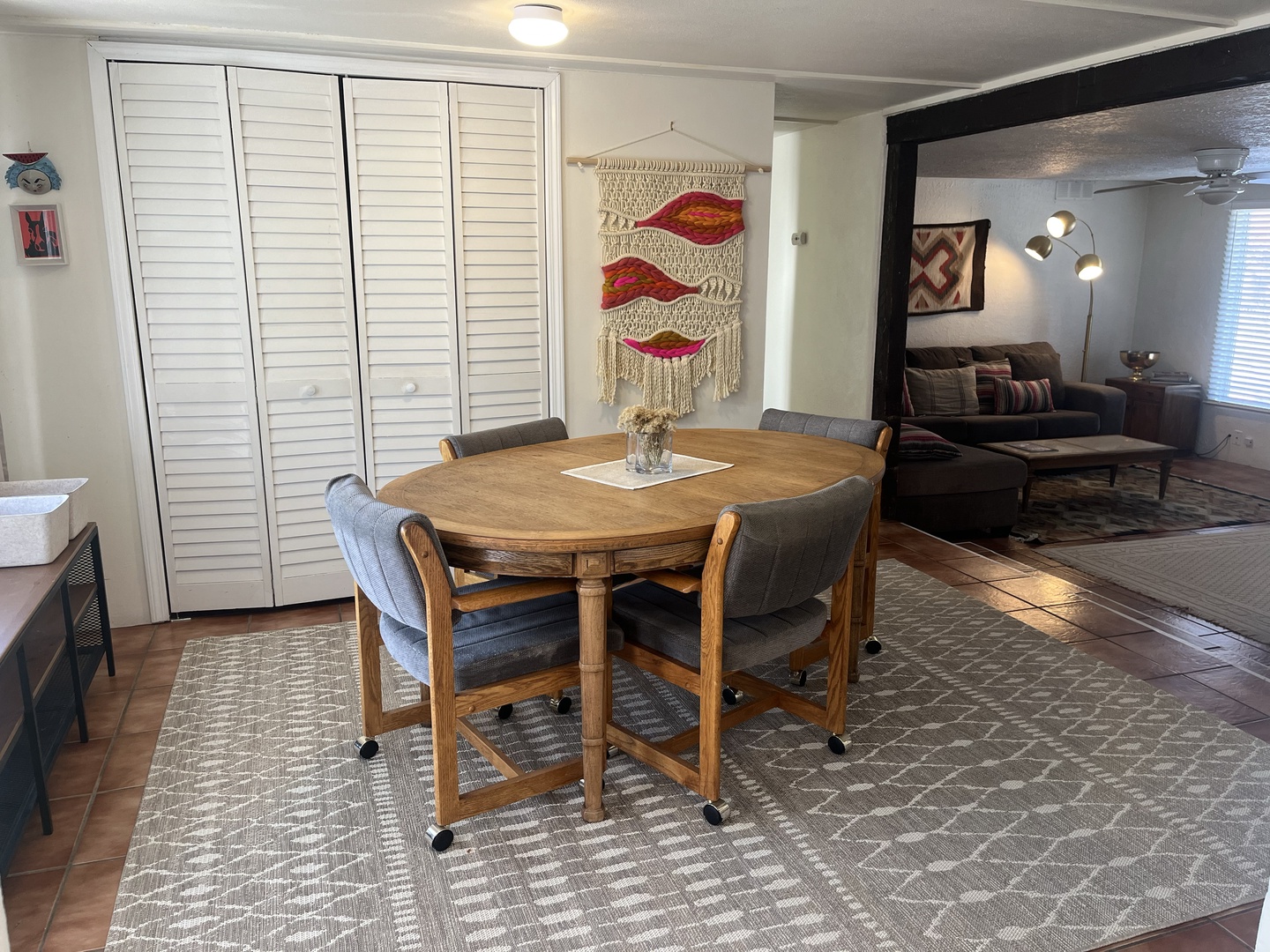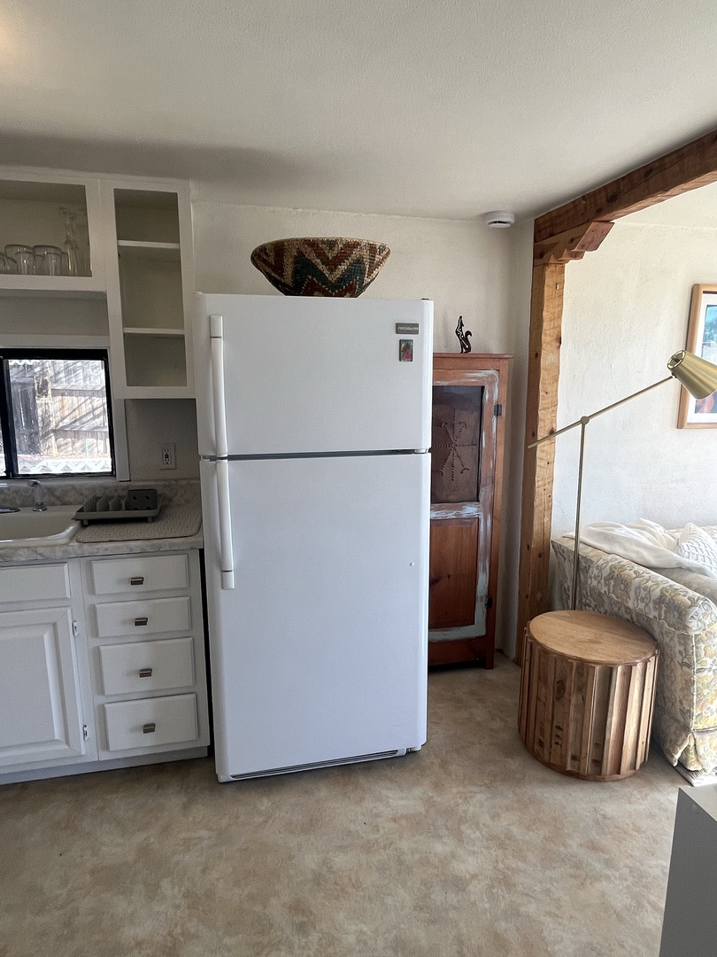 A sweet little place with lots of light and comfort, lovingly renovated and perfect for a carefree getaway in the heart of historic artisan village of Arroyo Seco. The home is comprised of one large primary bedroom with comfortable queen bed, a twin trundle bed room, and third sleeping space off the living area with a couch/full futon sleeping space and smart TV. There are two full hall baths, one wiht shower and the other with tub/shower combo. The spacious living room features a sectional sofa, coffee table, and two seats with footstools. The dining table seats 4 but there are two spare dining chairs in the futon room incase you need to seat a few more. The kitchen is simple, but well appointed and stocked for basic cooking and baking with a 4 burner gas stove and oven, microwave, drip and french press coffee makers, and full sized fridge. A full size washer and dryer fit neatly in a laundry closet. All needed kitchen, bath and laundry amenities are provided. The sun room area is just off the kitchen, and this is the perfect spot for sunny cat naps, cups of tea with a favorite read, or when you have to stay home and work on the computer while your mates are out playing in nature.
