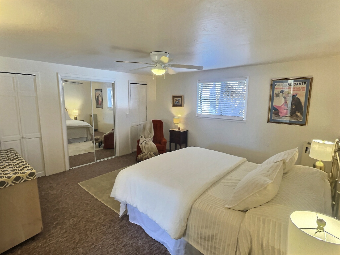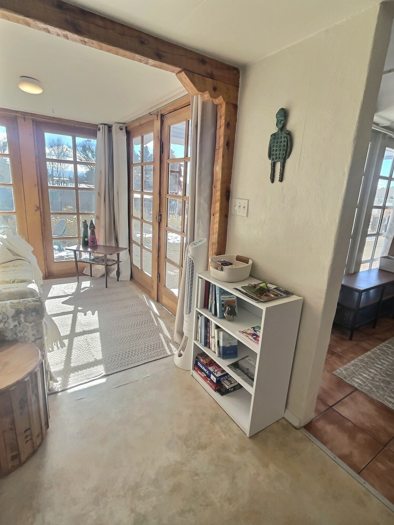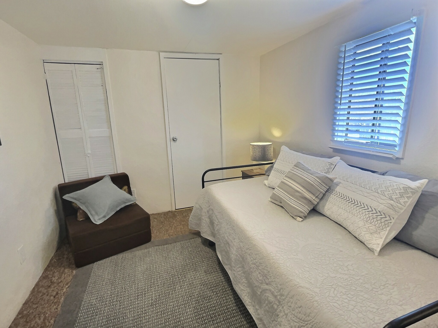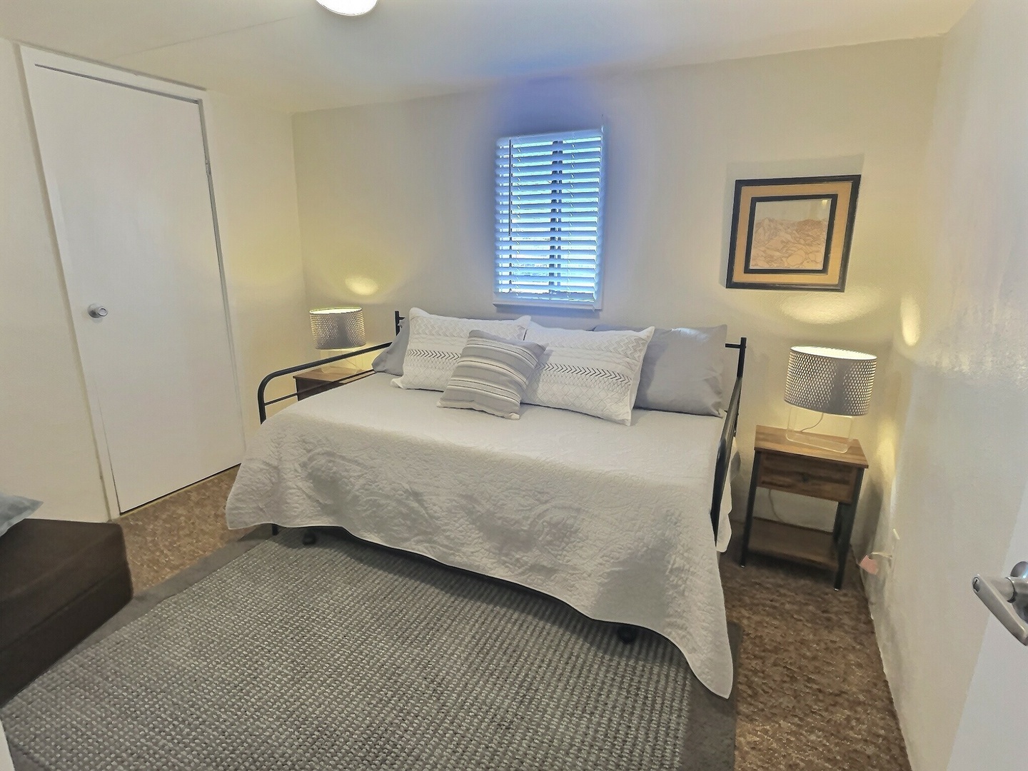 A sweet little place with lots of light and comfort, lovingly renovated and perfect for a carefree getaway in the heart of historic artisan village of Arroyo Seco. The home is comprised of one large primary bedroom with comfortable queen bed, a twin trundle bed room, and third sleeping space off the living area with a couch/full futon sleeping space and smart TV. There are two full hall baths, one wiht shower and the other with tub/shower combo. The spacious living room features a sectional sofa, coffee table, and two seats with footstools. The dining table seats 4 but there are two spare dining chairs in the futon room incase you need to seat a few more. The kitchen is simple, but well appointed and stocked for basic cooking and baking with a 4 burner gas stove and oven, microwave, drip and french press coffee makers, and full sized fridge. A full size washer and dryer fit neatly in a laundry closet. All needed kitchen, bath and laundry amenities are provided. The sun room area is just off the kitchen, and this is the perfect spot for sunny cat naps, cups of tea with a favorite read, or when you have to stay home and work on the computer while your mates are out playing in nature.