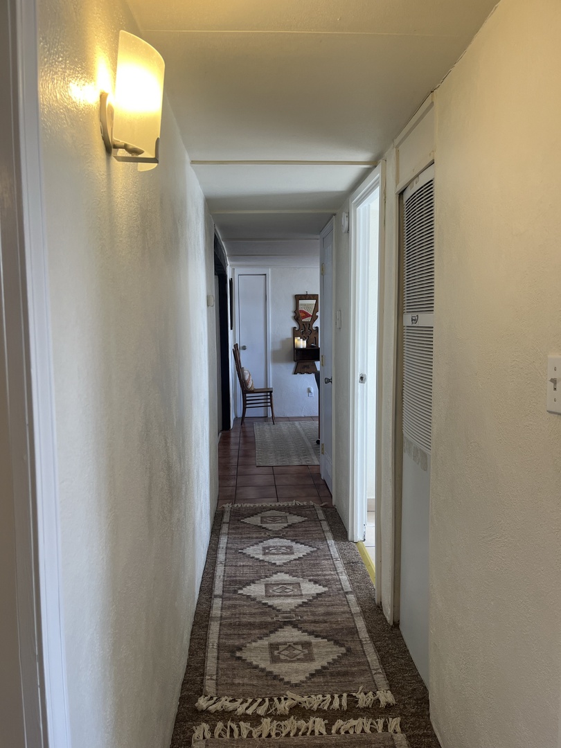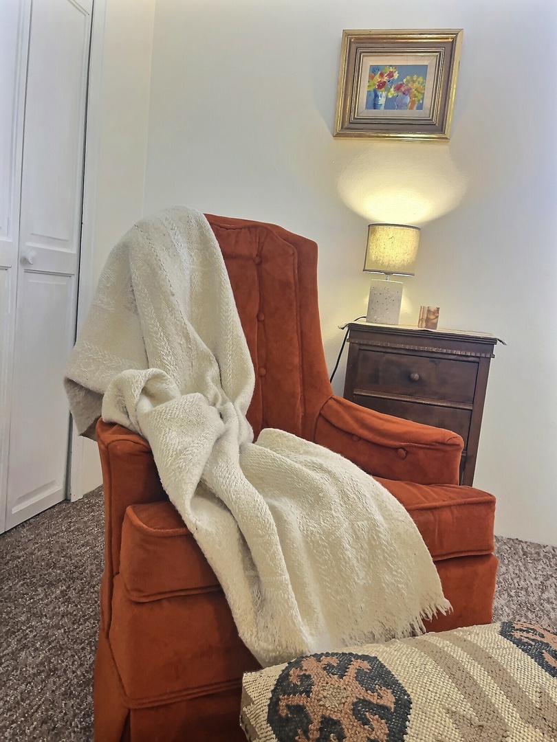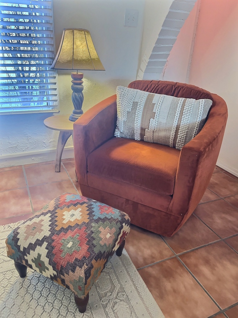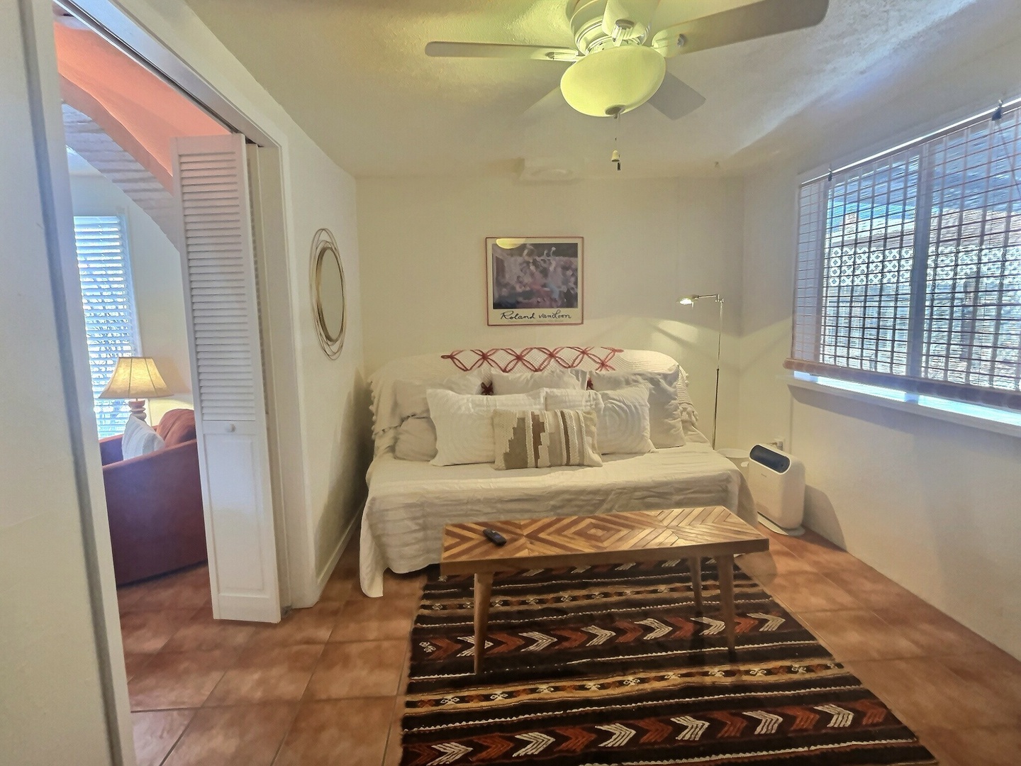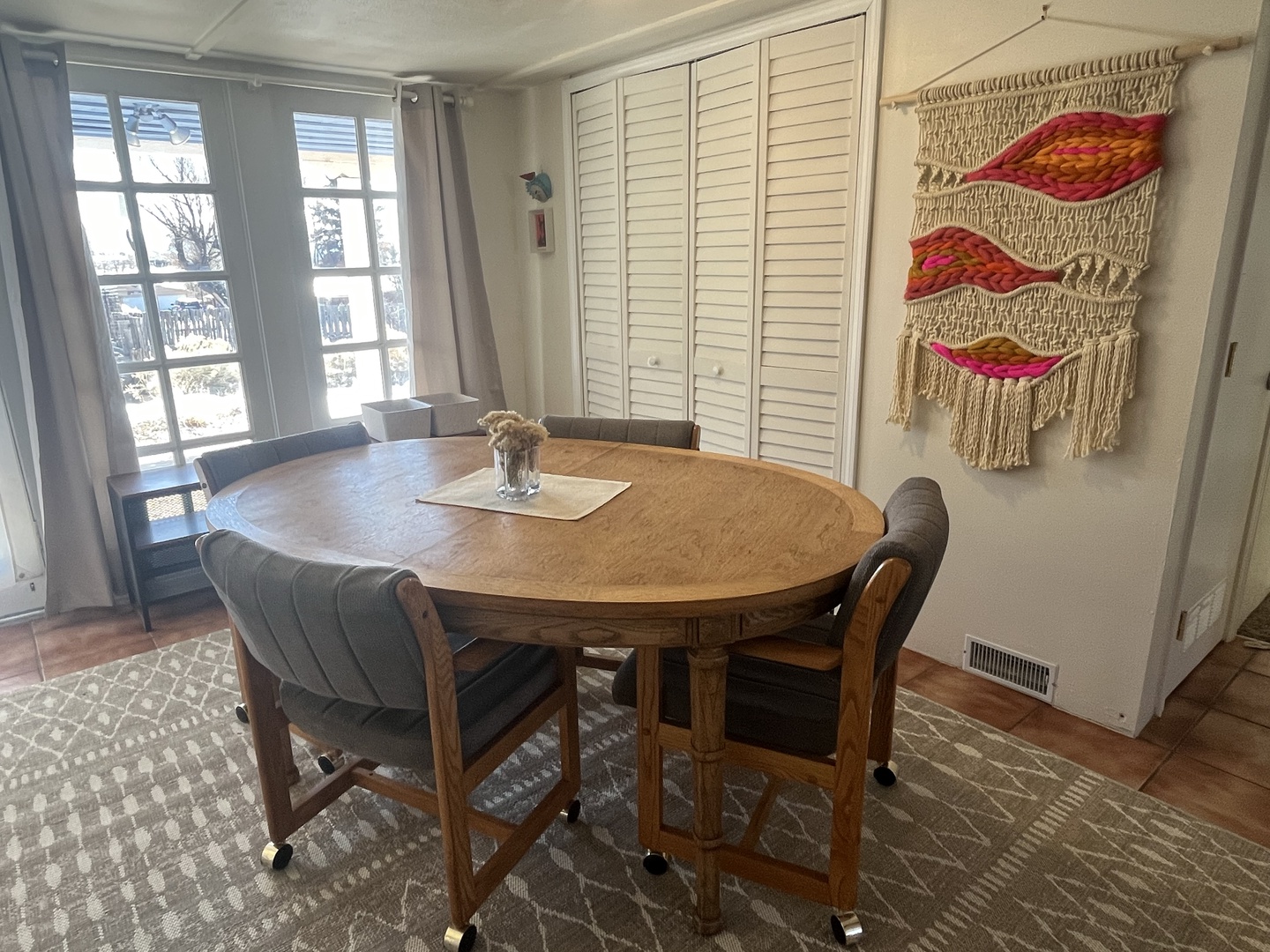 A sweet little place with lots of light and comfort, lovingly renovated and perfect for a carefree getaway in the heart of historic artisan village of Arroyo Seco. The home is comprised of one large primary bedroom with comfortable queen bed, a twin trundle bed room, and third sleeping space off the living area with a couch/full futon sleeping space and smart TV. There are two full hall baths, one wiht shower and the other with tub/shower combo. The spacious living room features a sectional sofa, coffee table, and two seats with footstools. The dining table seats 4 but there are two spare dining chairs in the futon room incase you need to seat a few more. The kitchen is simple, but well appointed and stocked for basic cooking and baking with a 4 burner gas stove and oven, microwave, drip and french press coffee makers, and full sized fridge. A full size washer and dryer fit neatly in a laundry closet. All needed kitchen, bath and laundry amenities are provided. The sun room area is just off the kitchen, and this is the perfect spot for sunny cat naps, cups of tea with a favorite read, or when you have to stay home and work on the computer while your mates are out playing in nature.