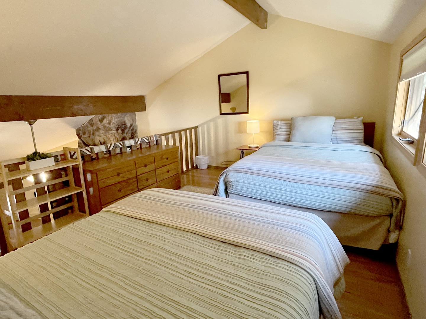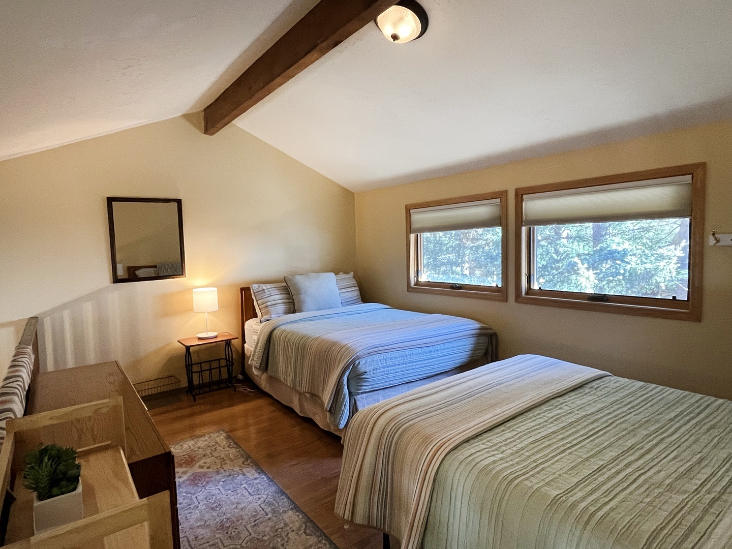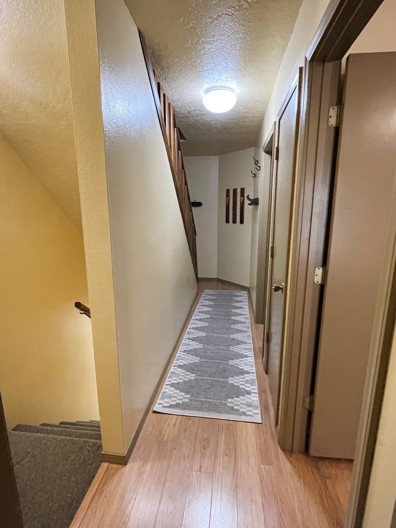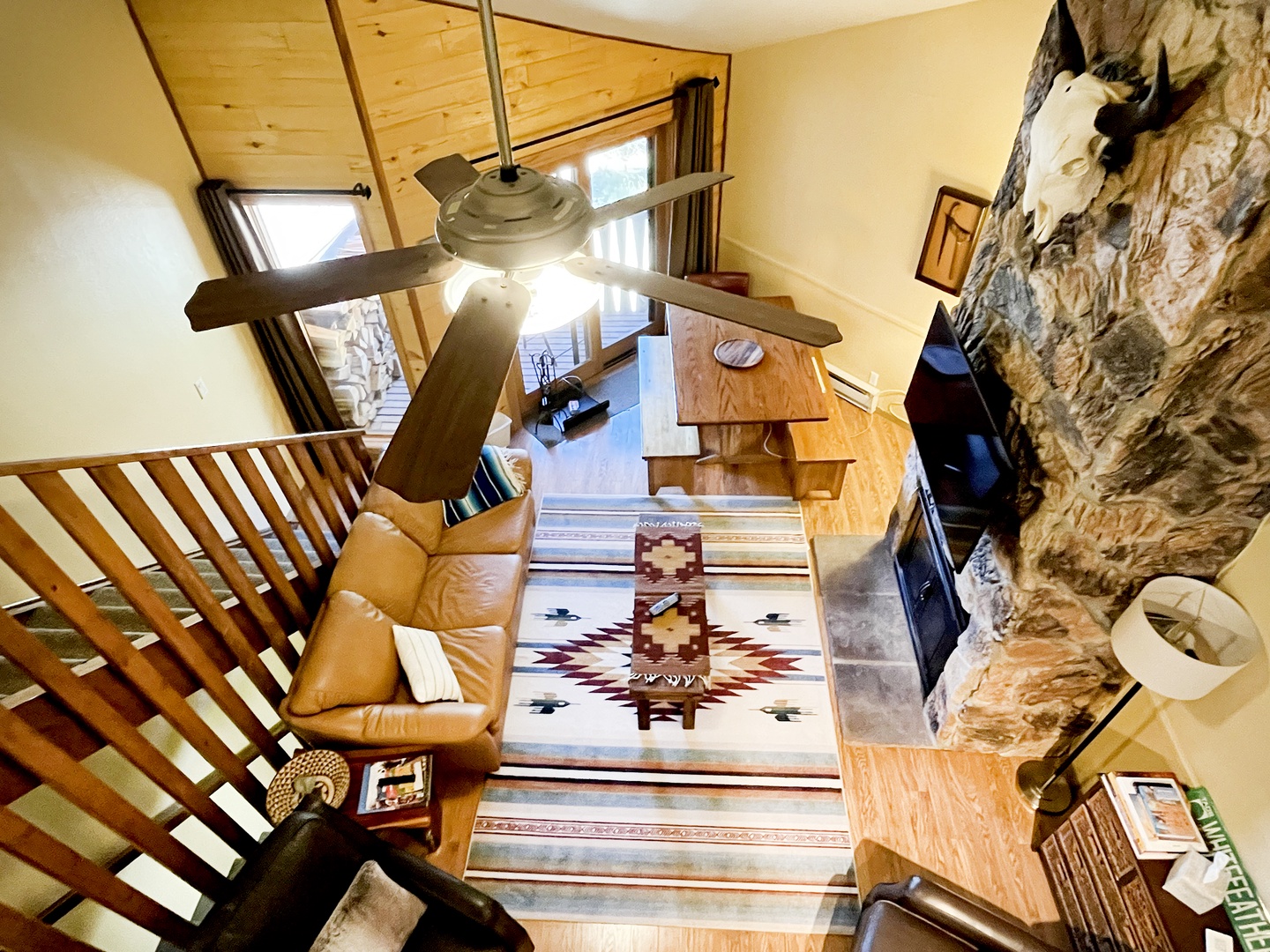 FAQ on Stairs: The first flight gets you to the bathroom and two bedrooms. That's usually where ski accessories get stored like boots in the hallway. Helmets, coats. Bedrooms have small closets. The next flight takes you to the living and dining areas, kitchen and second bath. The third flight accesses a loft sleeping space. So only the people staying in the loft do a third flight. Extra high altitude training for them.