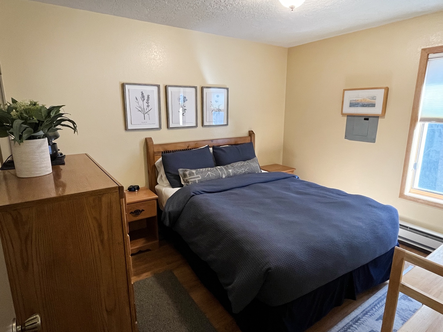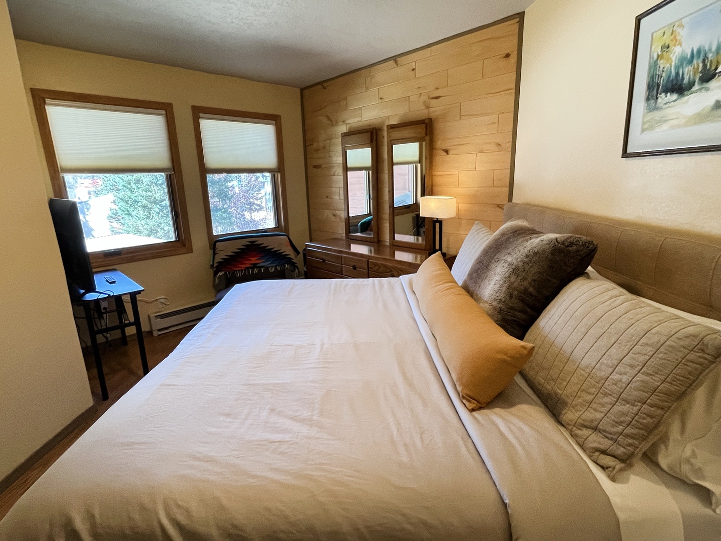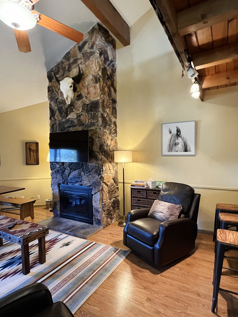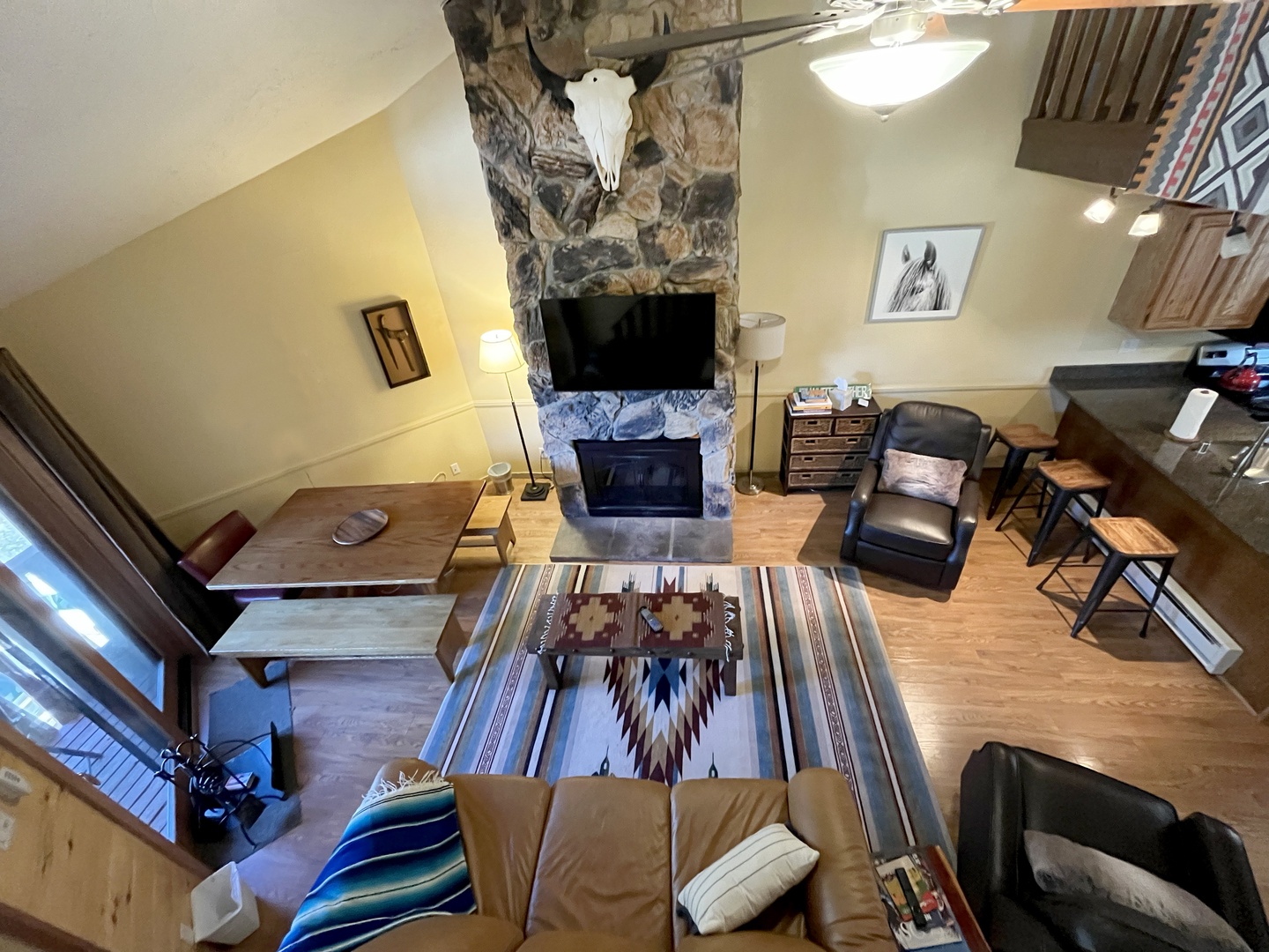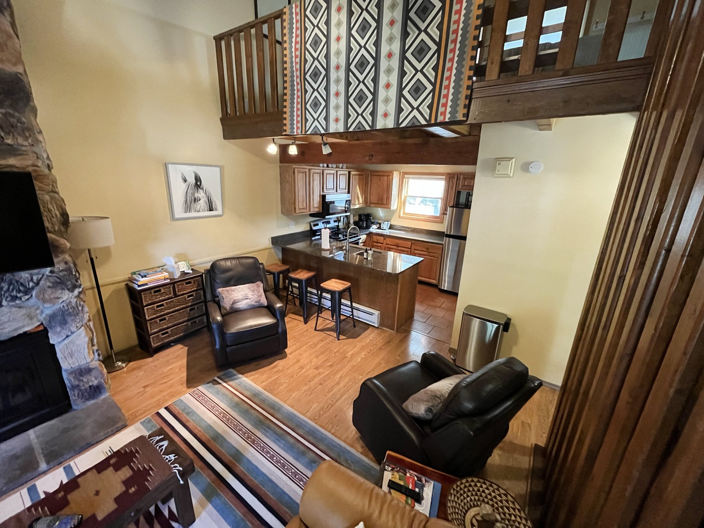 This cool home is right in the heart of Taos Ski Valley. It offers two living levels, two bedrooms, a sleeping loft, and two full bathrooms. This comfortable ski condo is the perfect place to bring friends or family. The first floor has two bedrooms and first bath with tub. An open concept second level includes dining area, kitchen with bar, and comfortable living room featuring a wood burning fireplace, and deck overlooking the ski area and lift one. Plentiful, large windows and sliding glass door let you soak in the view and enjoy the refreshing mountain breezes in the summer months. There is an open sleeping loft above the living level. The condo booking includes on site parking for one vehicle. Free WiFi. There are three flights of stairs in this unit. We are available if needed during your stay. Visit Black Diamond Espresso for coffee. Naranja at the Edelweiss for breakfast. Taos Ale House for lunch, apres at the Rio Hondo in the Snake Dance. Ask for more, we are always happy to help. Park the car when you arrive at the condo and walk to all that Taos Ski Valley has to offer. No Pets are accepted by this Condo Owners Association.