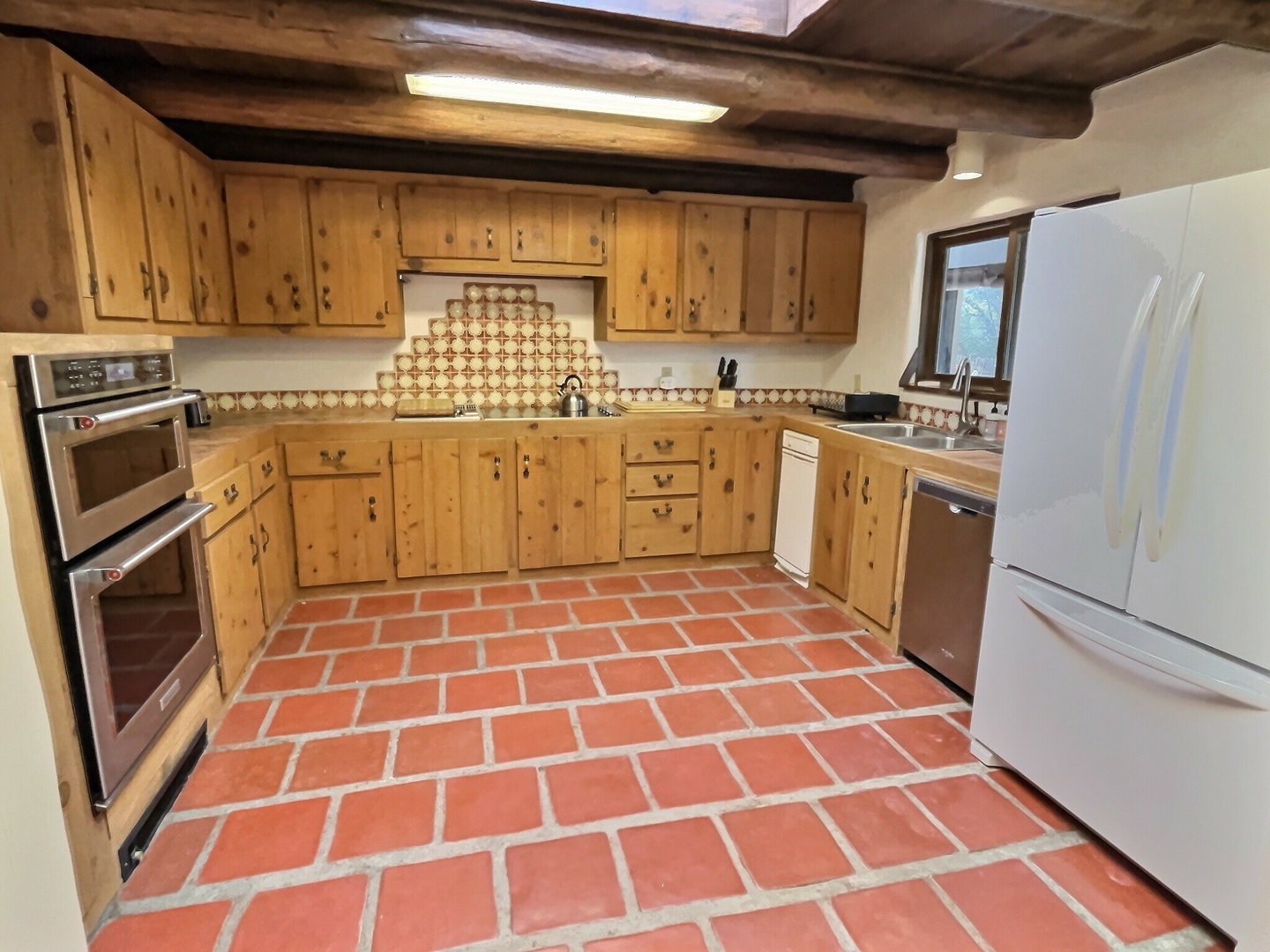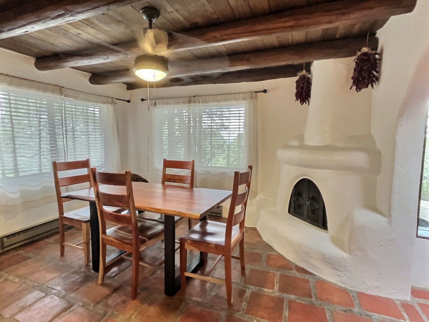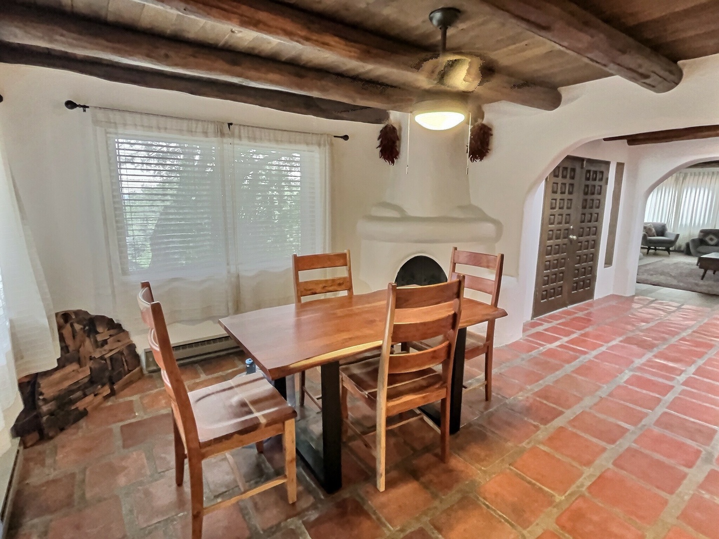 Dining area with kiva fireplace, dark viga ceilings, saltillo and white plaster for authentic New Mexican feel