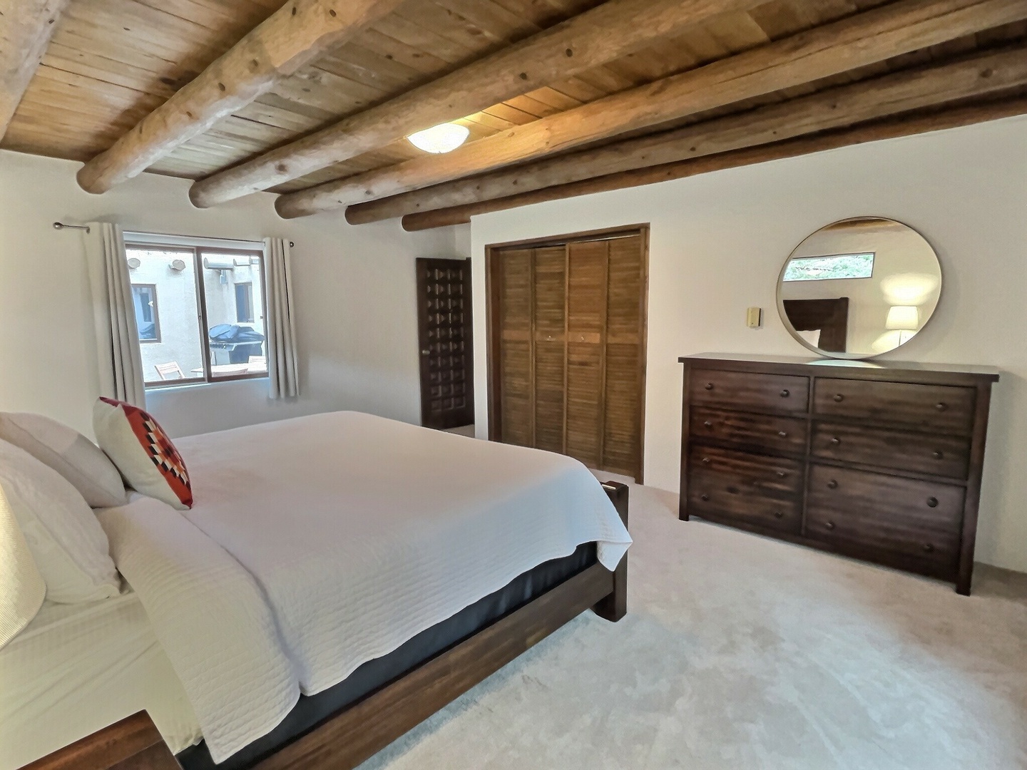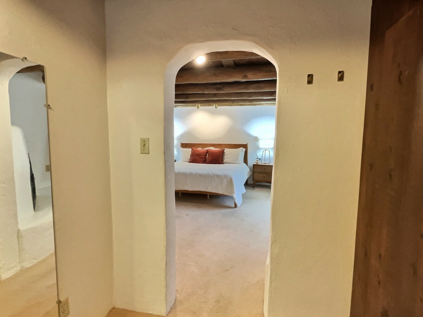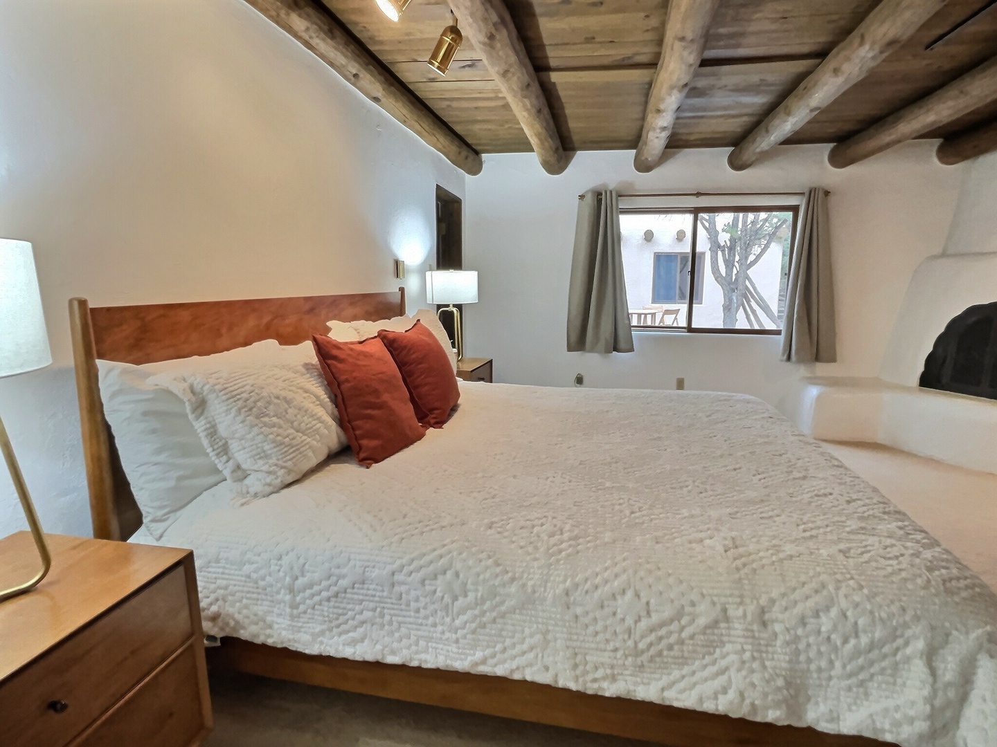 Master bedroom with vigas and fireplace