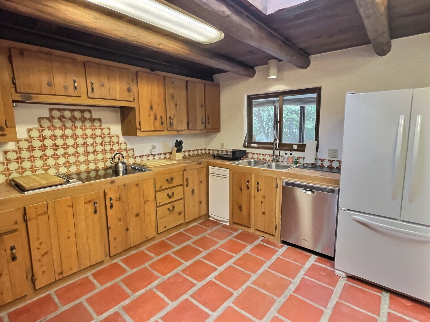 Abode Vacation offers Los Pions, a three bedroom, two bathroom Adobe home on pine forest land just outside of Taos, New Mexico. A spacious adobe home with white plaster walls, dark wood vigas, and Saltillo tiles accented by two large traditional New Mexico fireplaces in the dining area and the living room.\r\nBedrooms feature carpet and ample closet space.\r\nKitchen features plenty of pantry storage and a large refrigerator.