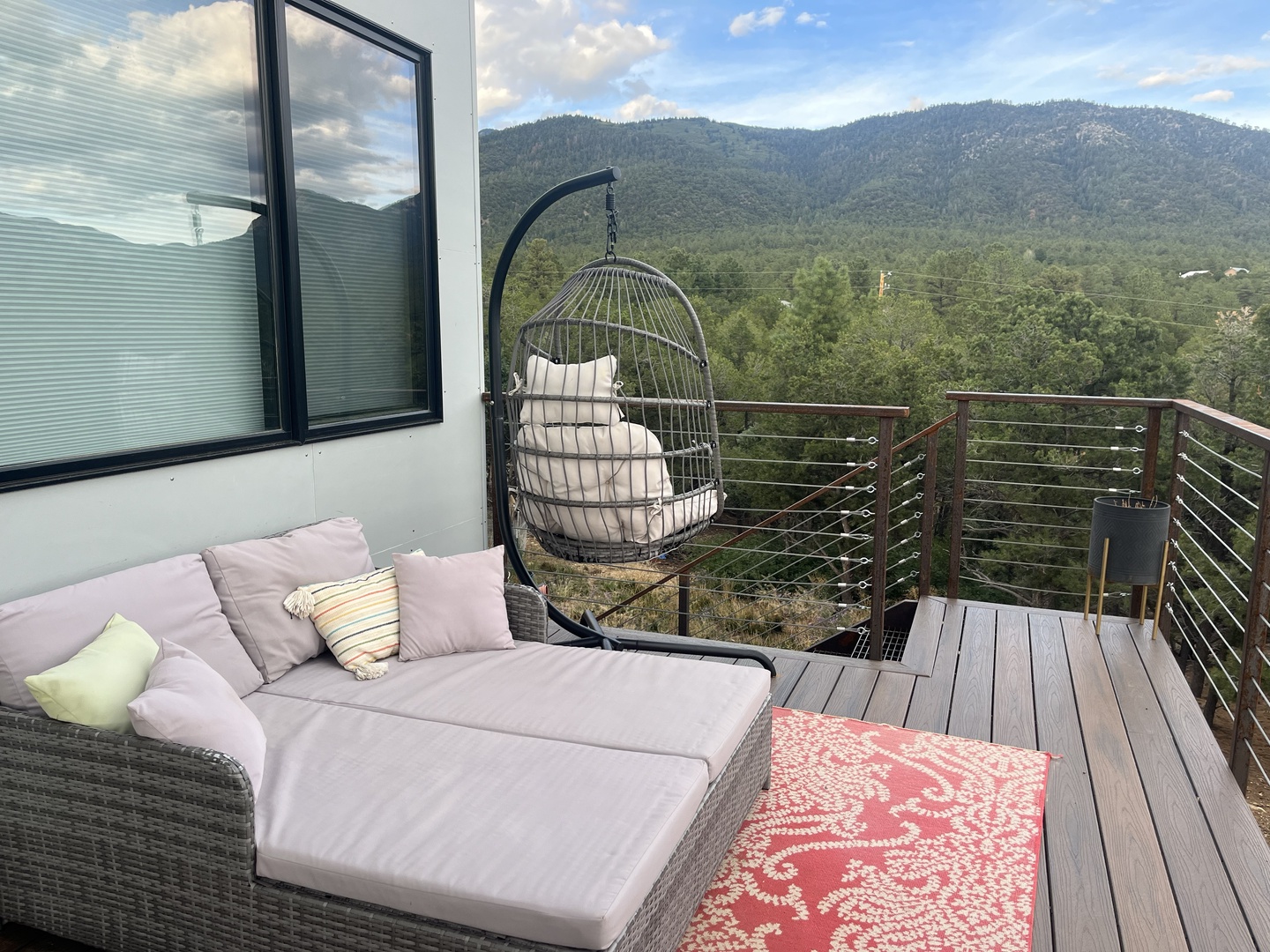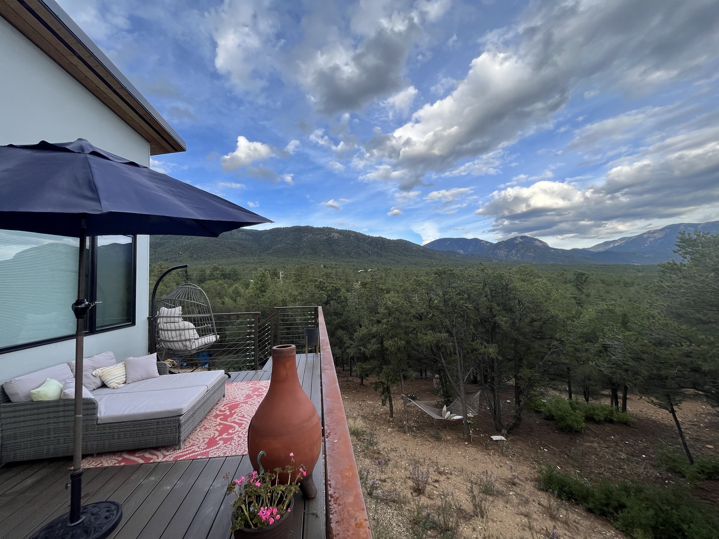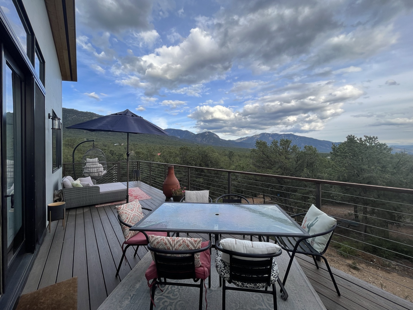 This beautiful, modern four bedroom, two and a half bathroom home is perfect for inspiring joy and relaxation in a peaceful and quiet setting. Make treasured memories with the people you love in the pine and oak dotted foothills of the Sangre de Cristo mountains. All four bedrooms are on the ground floor and spacious, light filled living, dining, kitchen and entertaining deck are located on the upper level. \r\nKing bedroom suite is spacious, with large closet, TV and full ensuite bathroom.