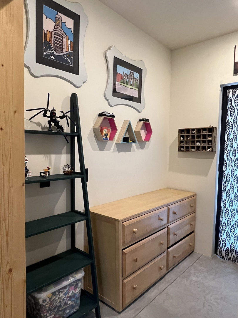 Second bunk room with dresser and shelving