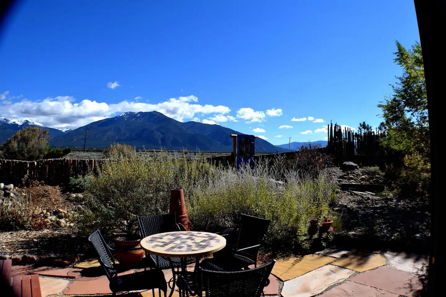 Momentitos is a wonderful Taos home. The Latilla and Adobe wall fences completely surround the home protecting the patio from the wind and giving the home a very secluded feeling.