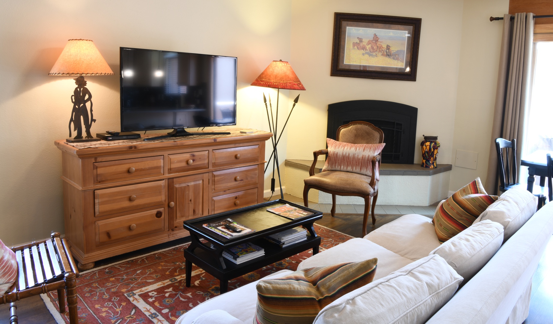 The living area is comfortable with a large flat screen TV. There is a great gas fireplace insert which heats the whole area.