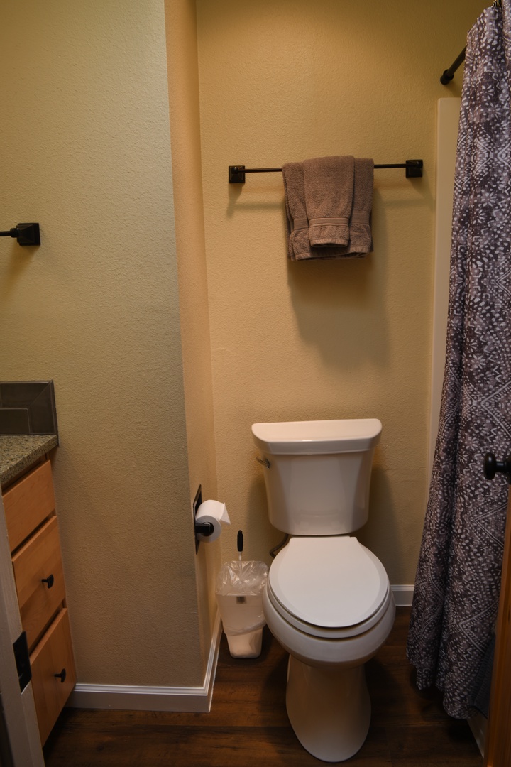 The third full bathroom with tub shower combo is off the kitchen living area. The bathrooms have plenty of towels and there is a hair dryer in each one. There is also a queen murphy bed that unfolds into the living area. Bedding is available in queen bedroom drawers and closets. Newly installed washer/dryer is in the unit.