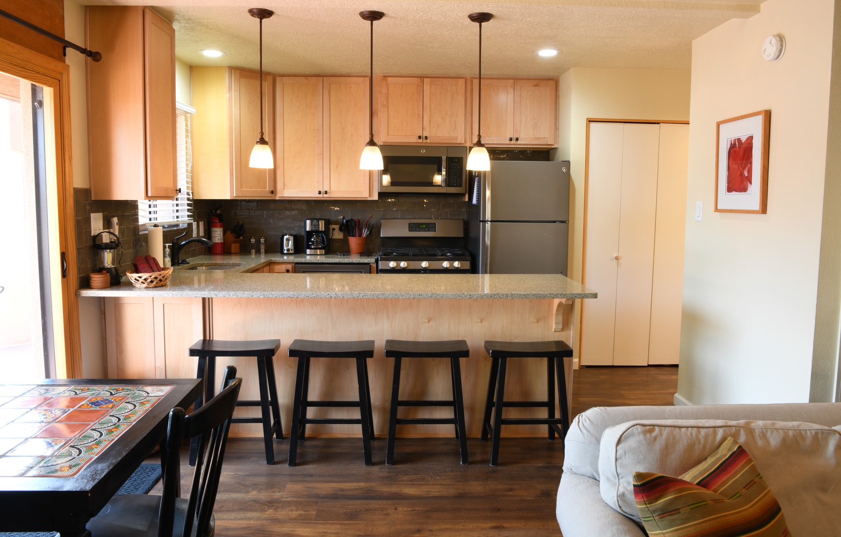 The kitchen is modern and fully equipped. The new appliances include a gas range, microwave and full refrigerator with ice maker. There is seating for 4 at the counter plus a tile top table with two chairs.