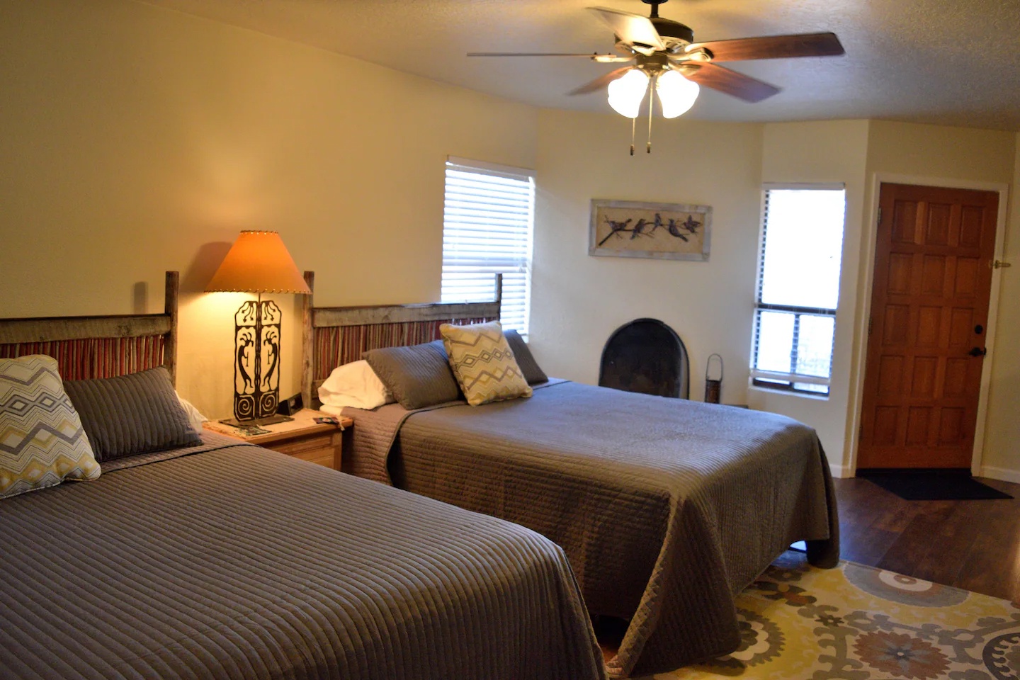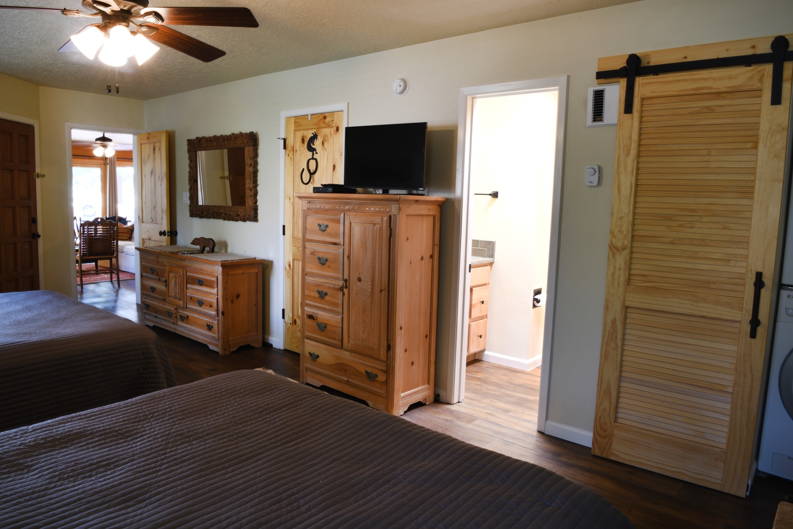 The mattresses and bedding are all new. The master suite is spacious with a king bed, kiva fireplace and ergonomic chair for reading or relaxing, a flat screen TV and ensuite bathroom with tub shower combo.