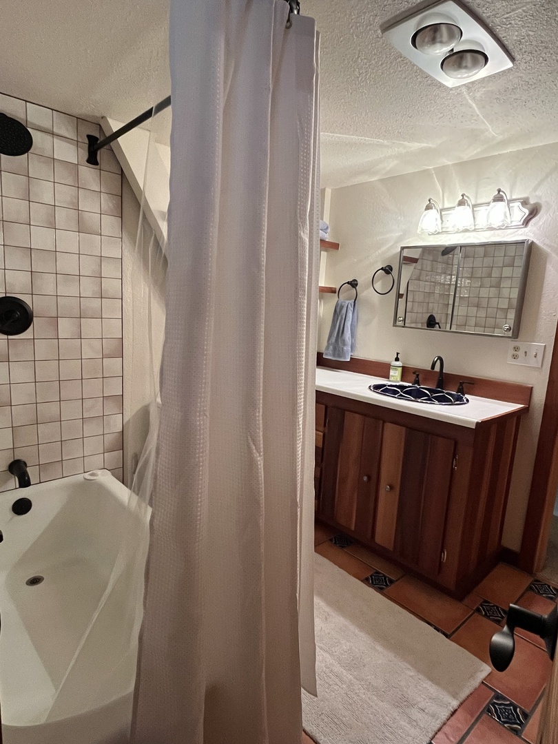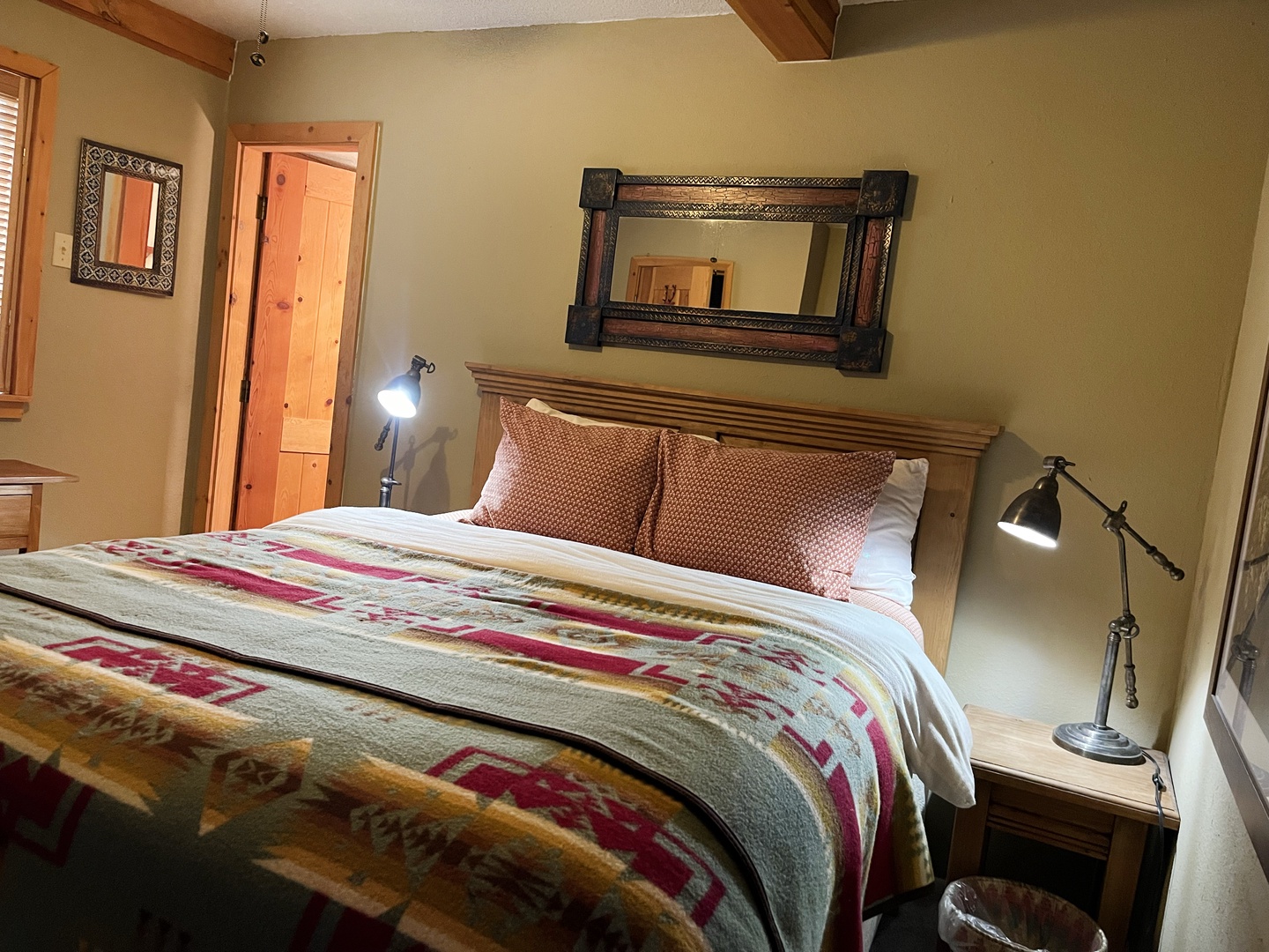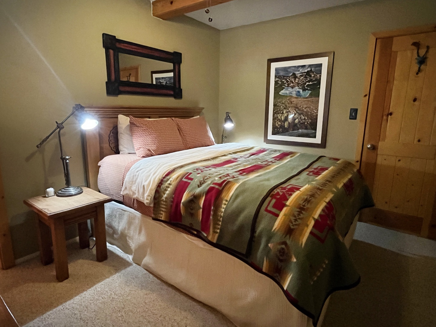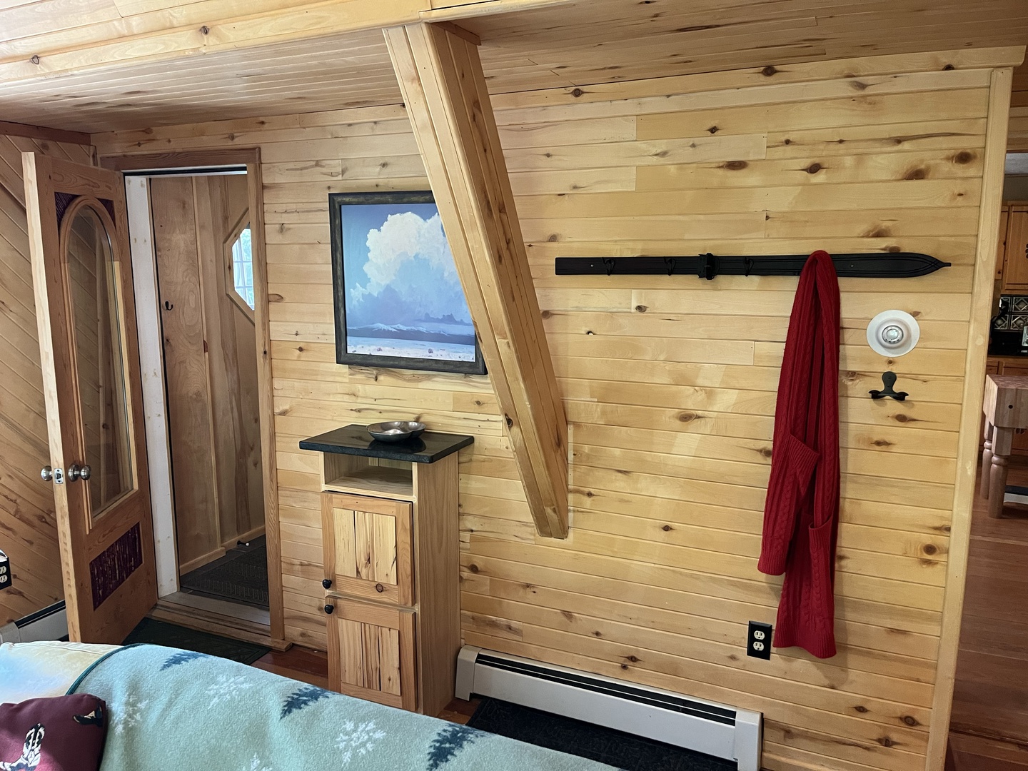 On the cabin side there is the primary ground level queen suite with luxury bed and bedding and newly remodeled full bathroom. The bathroom is private, if desired, or accessible from the hallway if suite occupants leave the hall door unlocked.