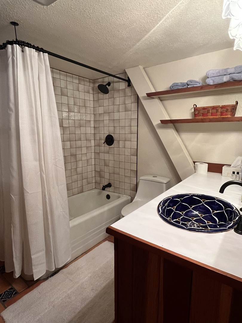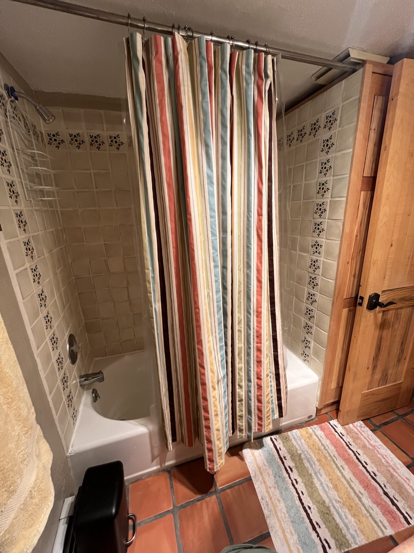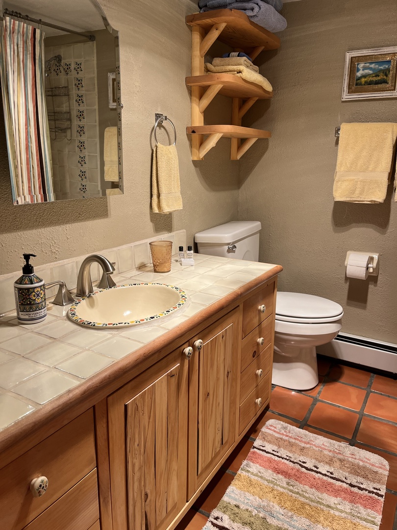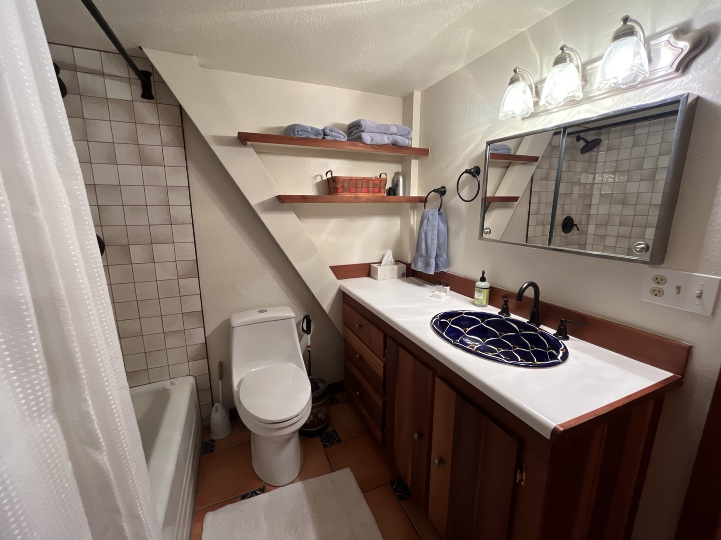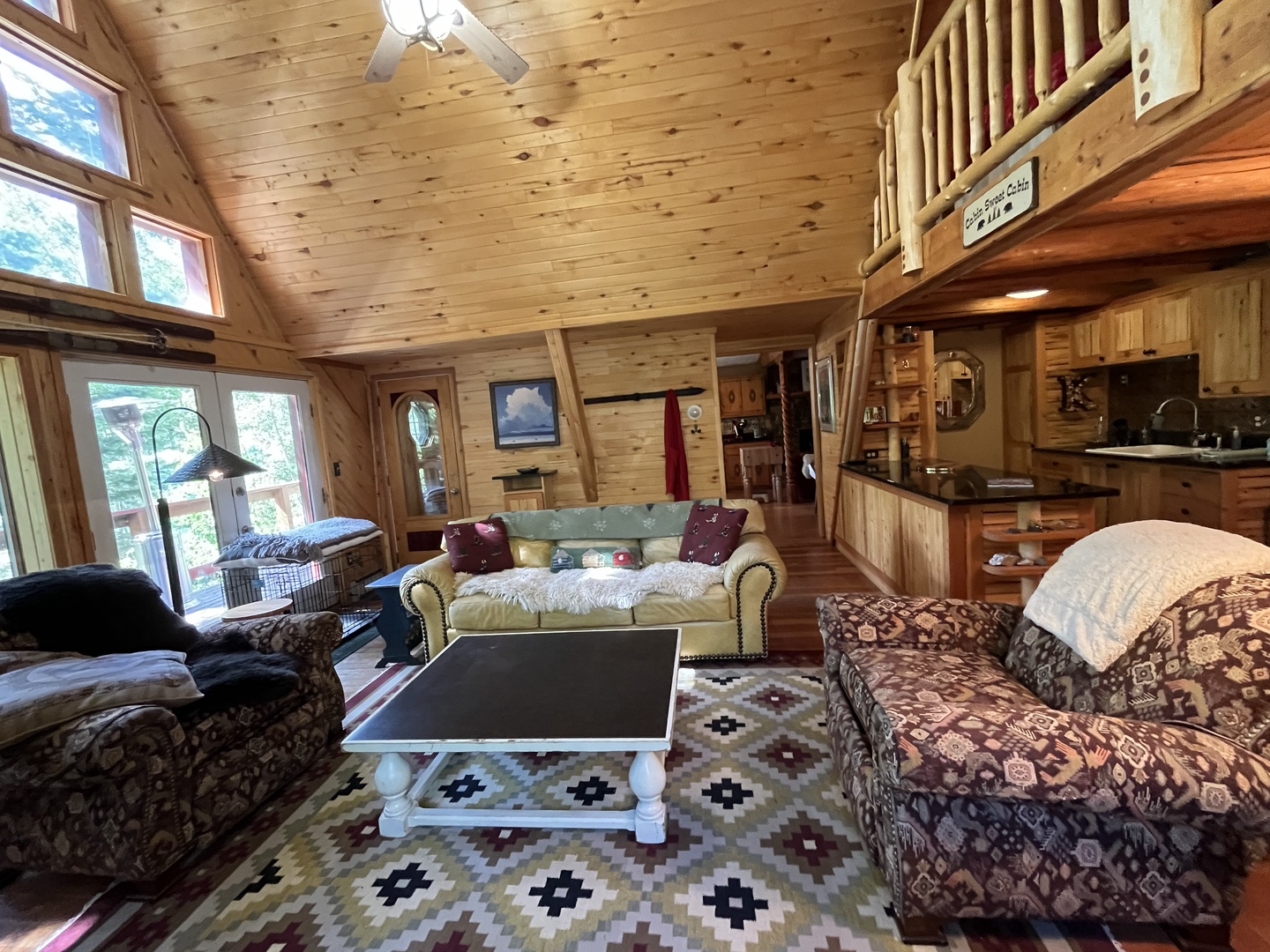 On the cabin side there is the primary ground level queen suite with luxury bed and bedding and newly remodeled full bathroom. The bathroom is private, if desired, or accessible from the hallway if suite occupants leave the hall door unlocked.