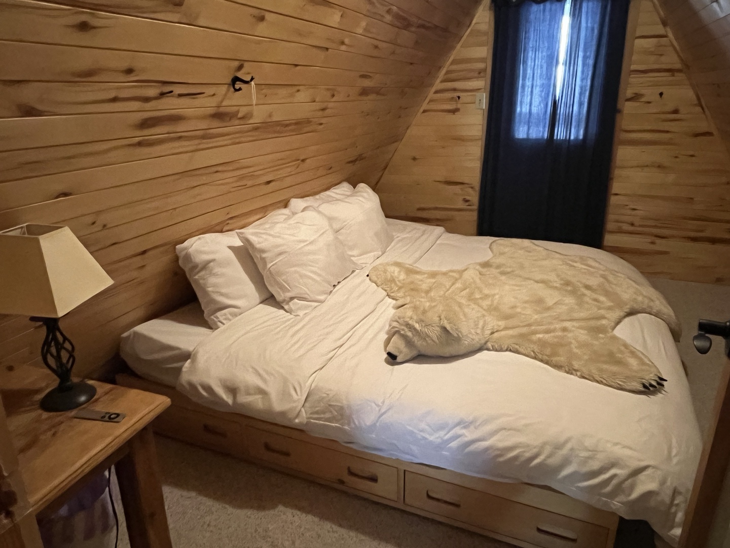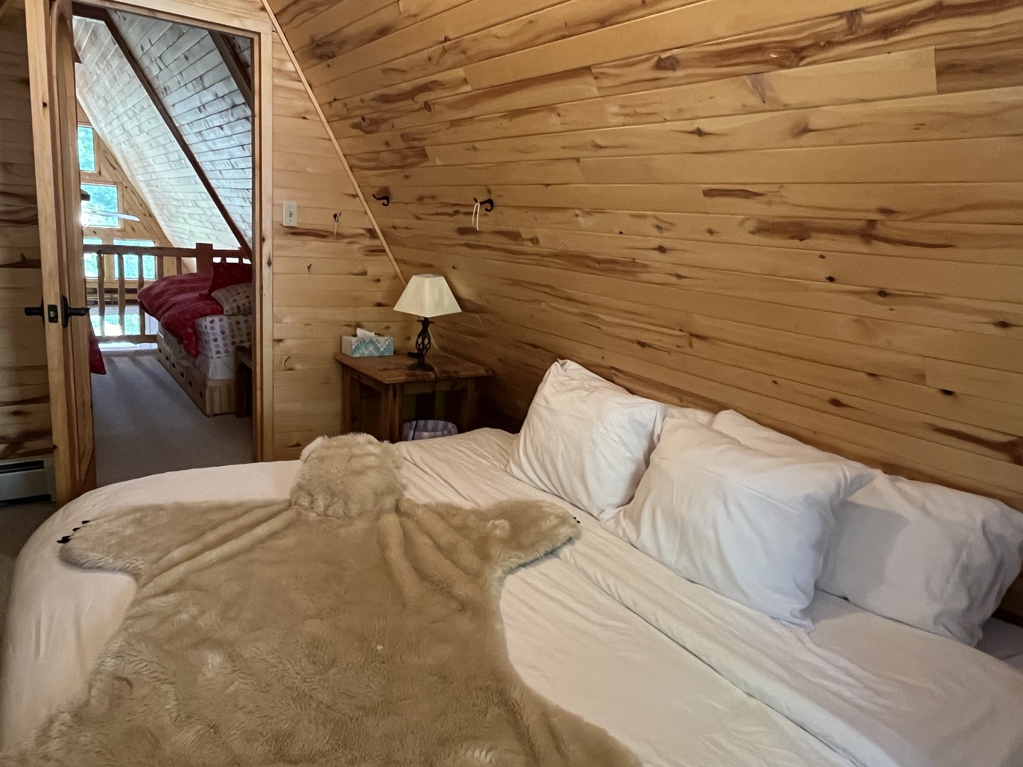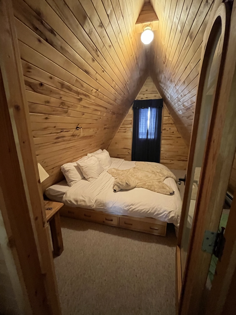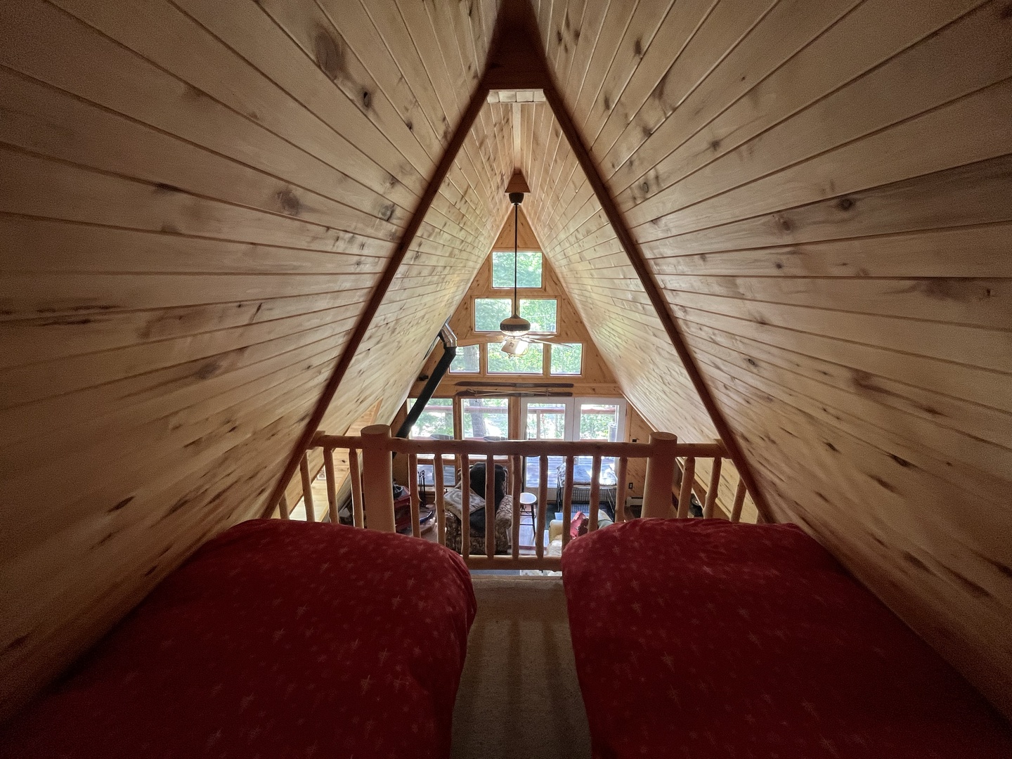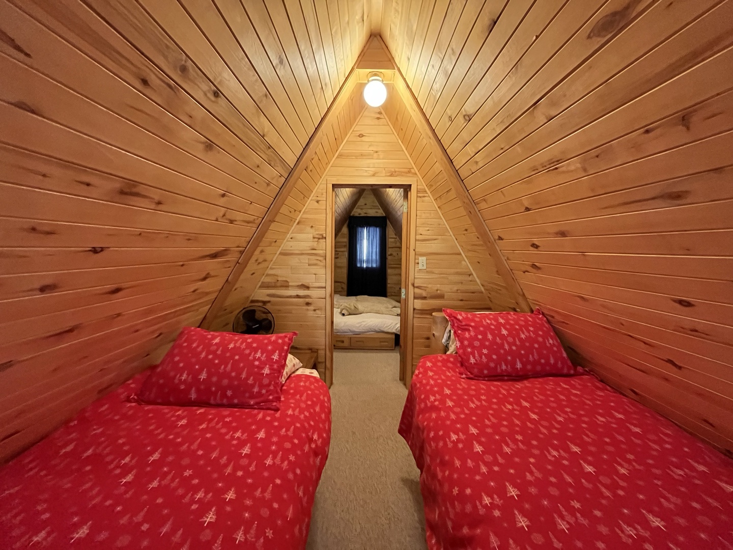 From the A frame side access the queen bedroom and bathroom, or head up the steep cabin stairs to the extra sleeping spaces a full mattress in a private bedroom with balcony and exit stairs, and a two twin loft overlooking the main living area.