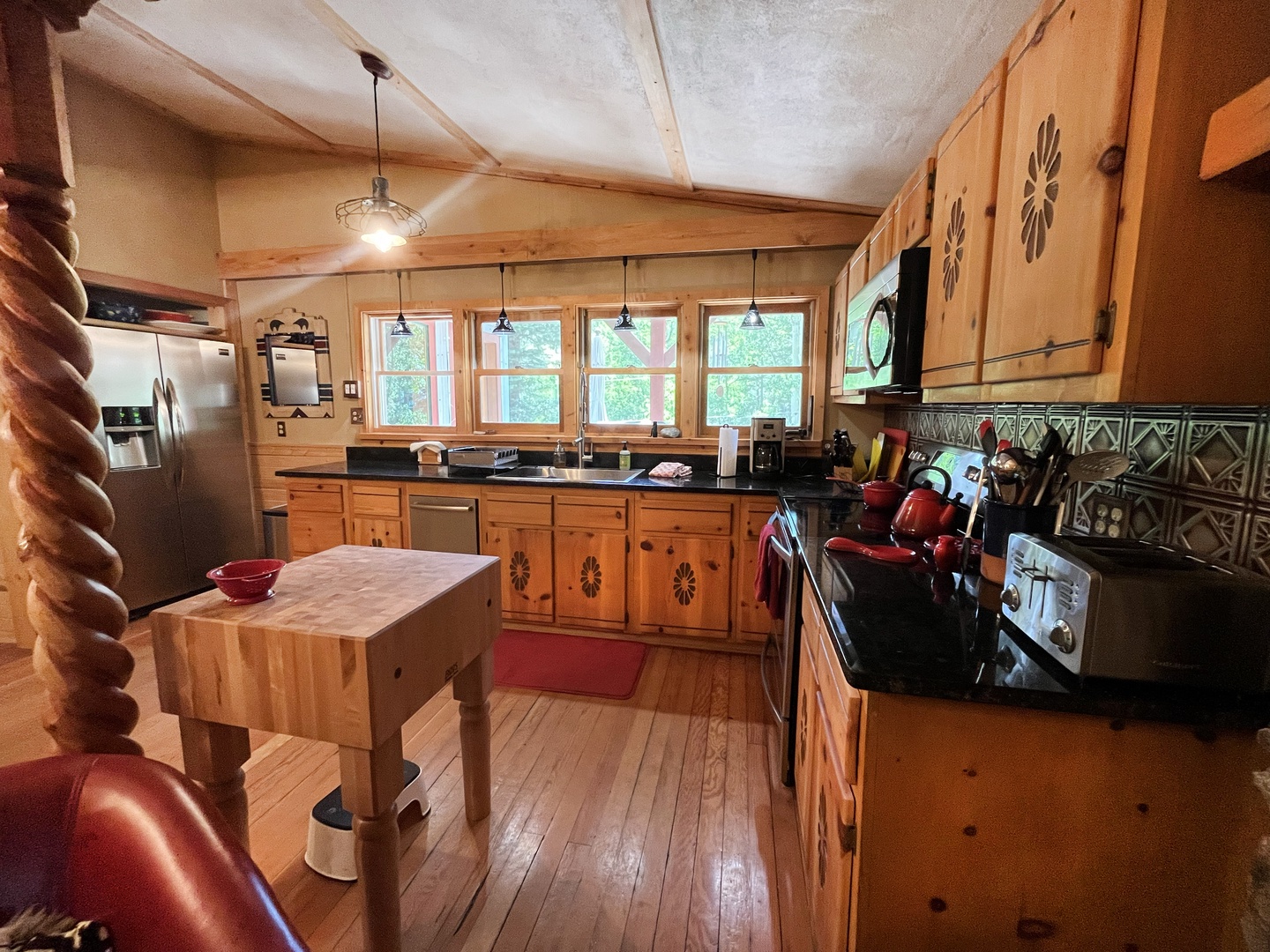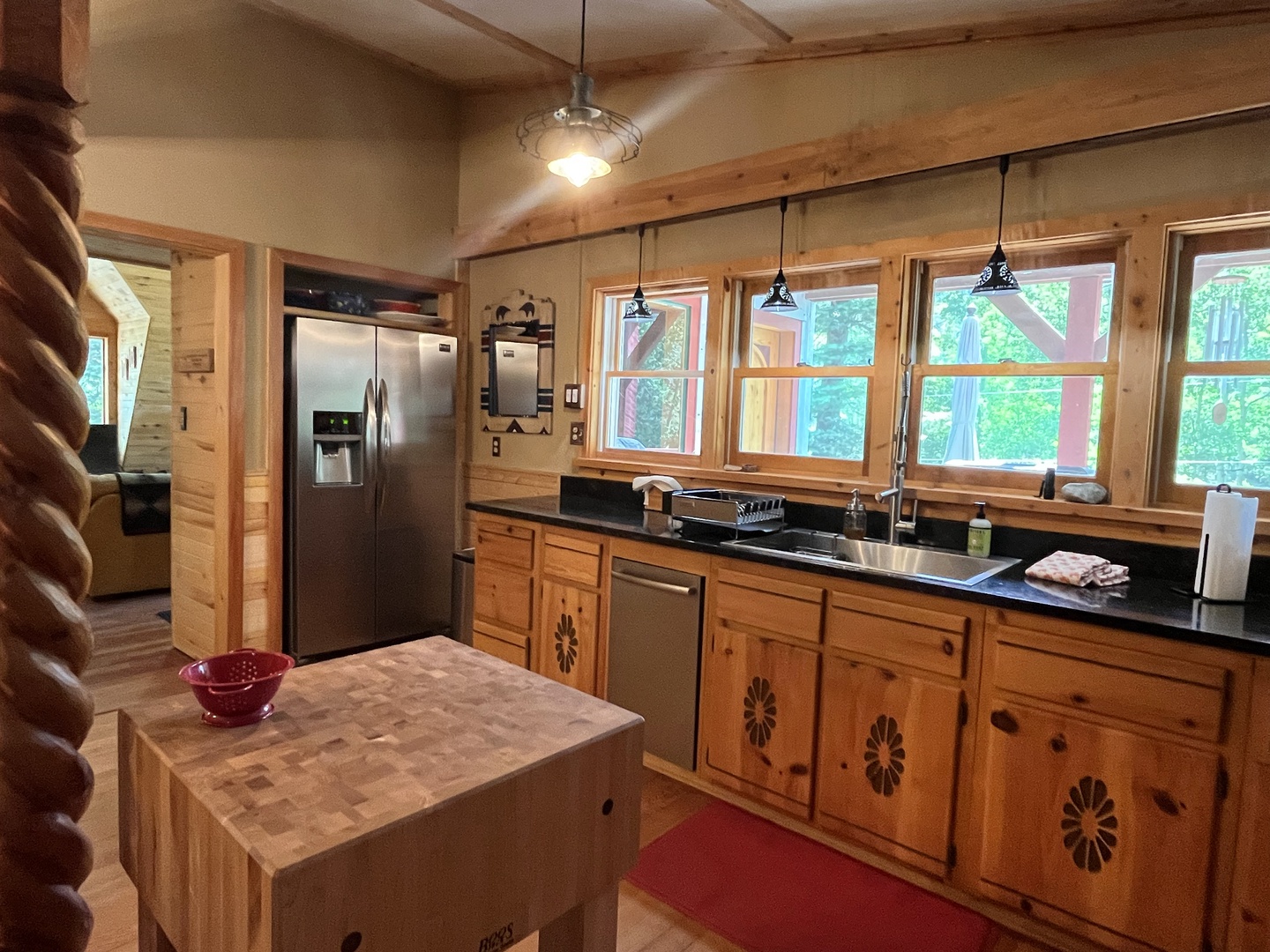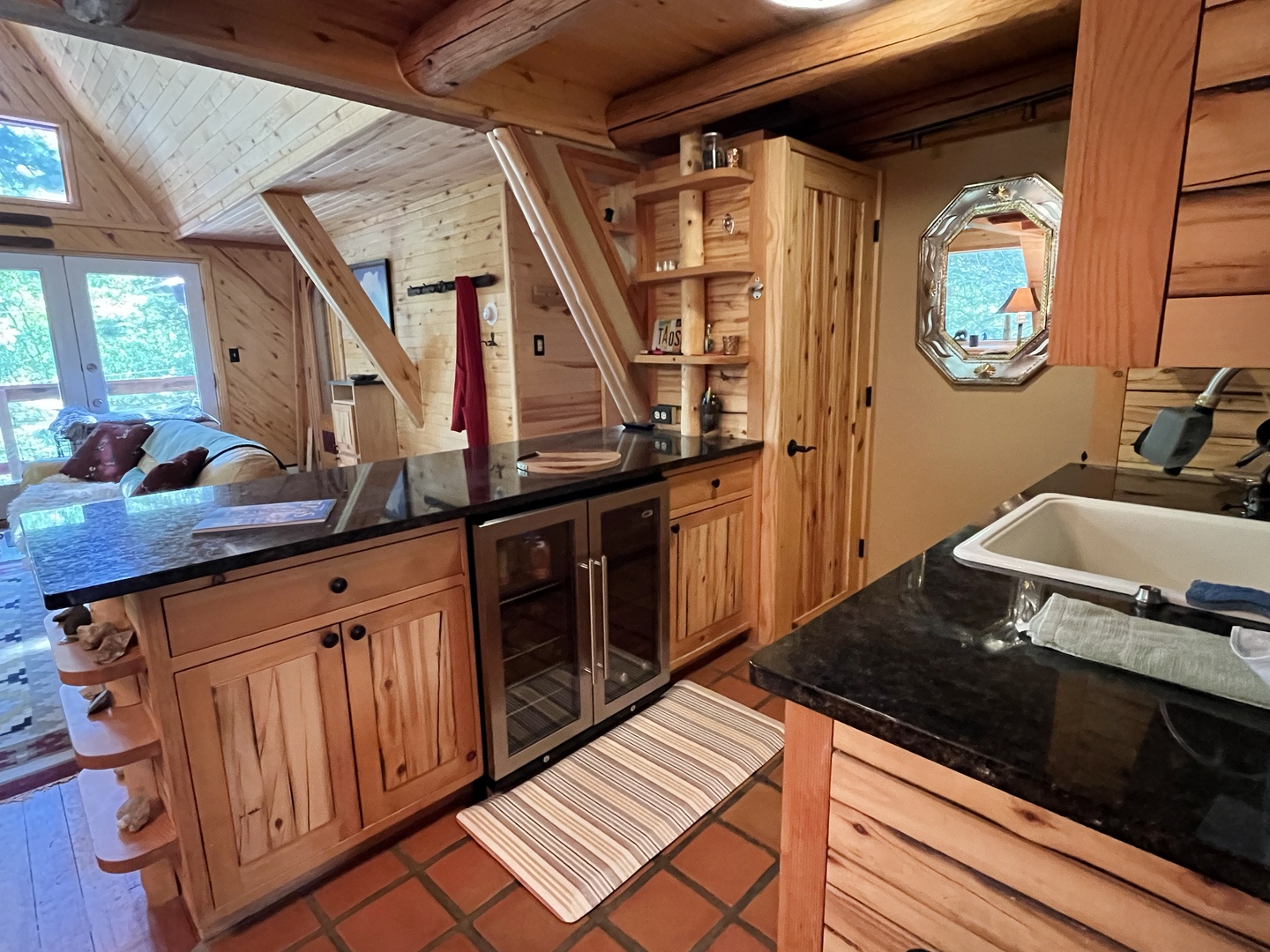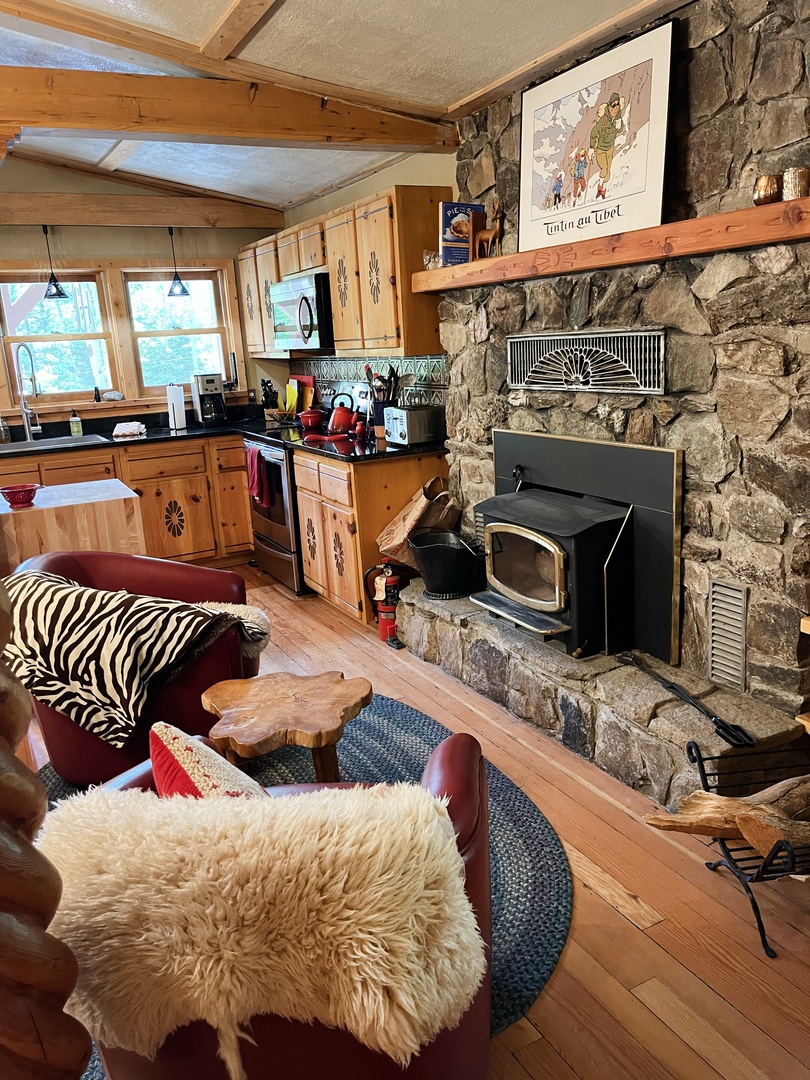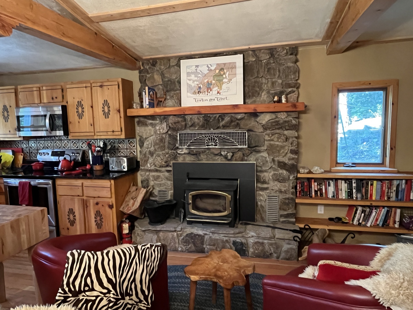 One large open concept living, dining and kitchen area with a central stone fireplace and wood stove is the working heart of the home. Pass through to the A-Frame side and enjoy a spacious living room entertaining area with large smart TV, windows to enjoy the mountain and forest surroundings, and the wet bar.