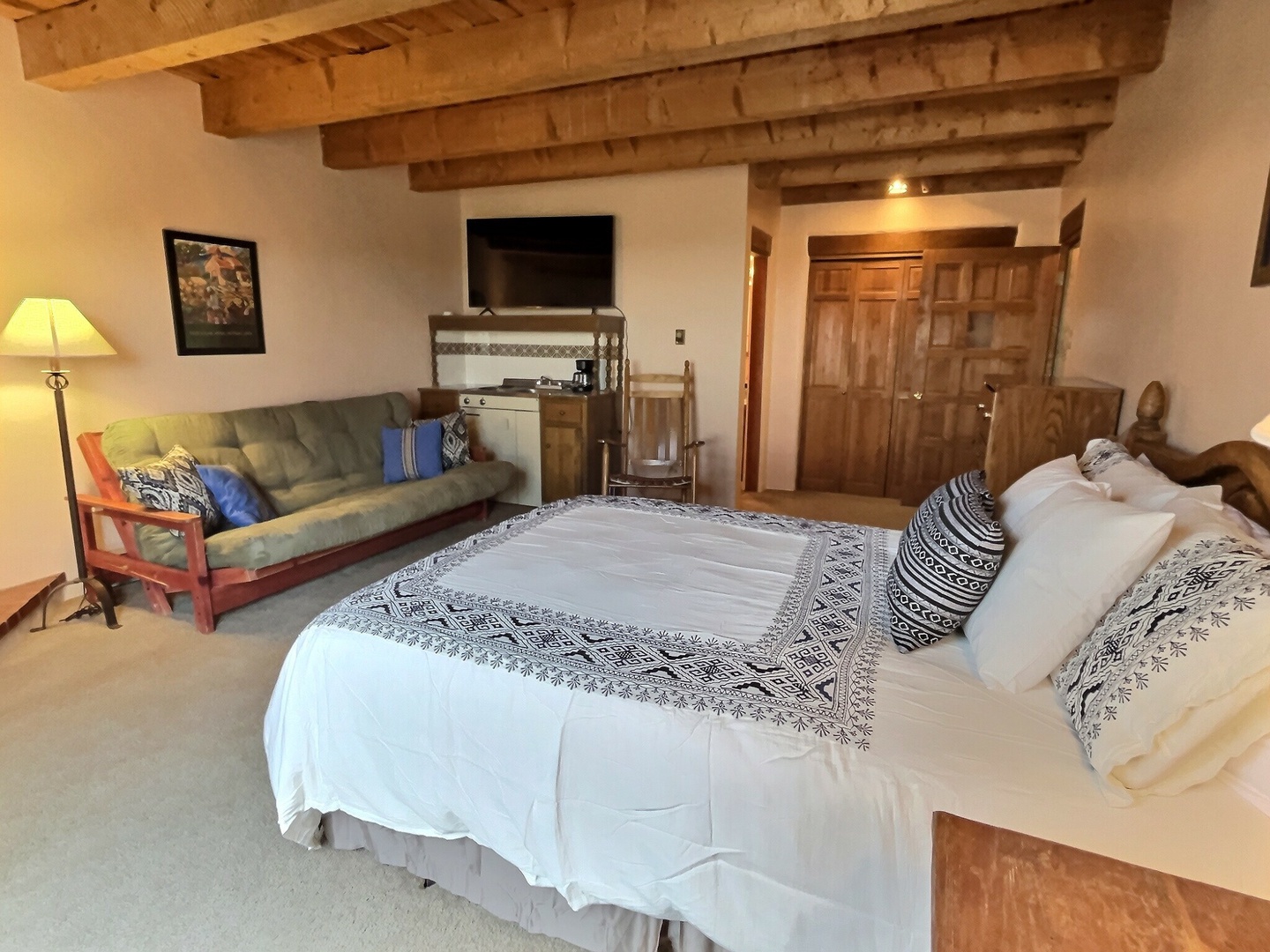 Bedroom view to private deck overlooking the Rio Hondo valley with seating