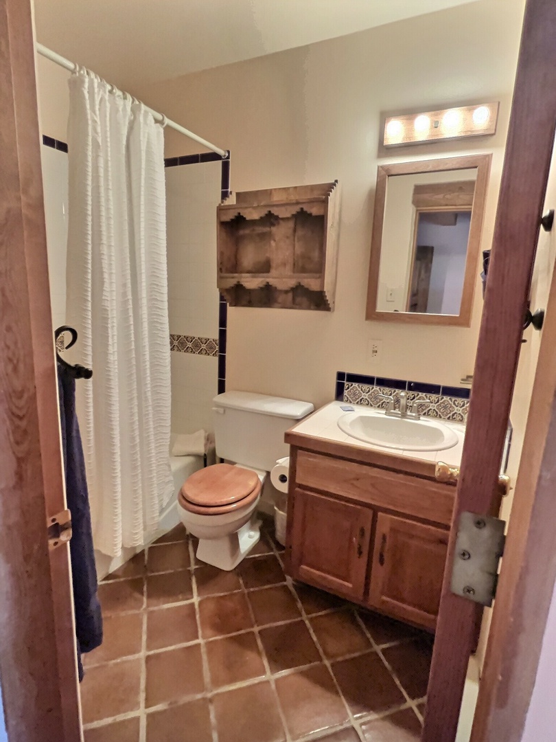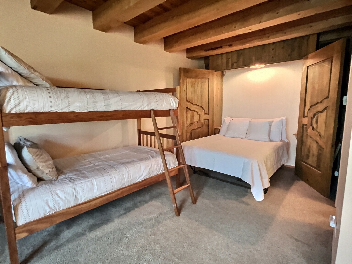 This well-appointed classic Taos home is perfectly located between Taos Ski Valley and Taos (10-15 minute drive), and just 5 minutes drive from the artisan village of Arroyo Seco. Situated overlooking the Rio Hondo river valley, a major recreation corridor which extends from Taos Ski Valley and many amazing National Forest trails, and fly and spin fishing, to the Rio Grande, guests can take advantage of being in the forest environment with all the comforts of being at home. Watching birds, or the just clouds rolling aloing the sky from the valley toward the mountains are relaxing favorite passtimes from the private front porch. A well stocked kitchen means you can make gourmet meals at home snuggled by the fireplace or watching a movie with the family on the Smart TV. Private, spacious, bedrooms on separate floors with ensuite baths and private porch means couples or family members have their own space, including a plush queen bed with new pillows and bedding, coffee maker and 70 smart TV in the upstairs suite, and full Murphy bed with twin bunkbeds and Smart TV in the middle level suite.