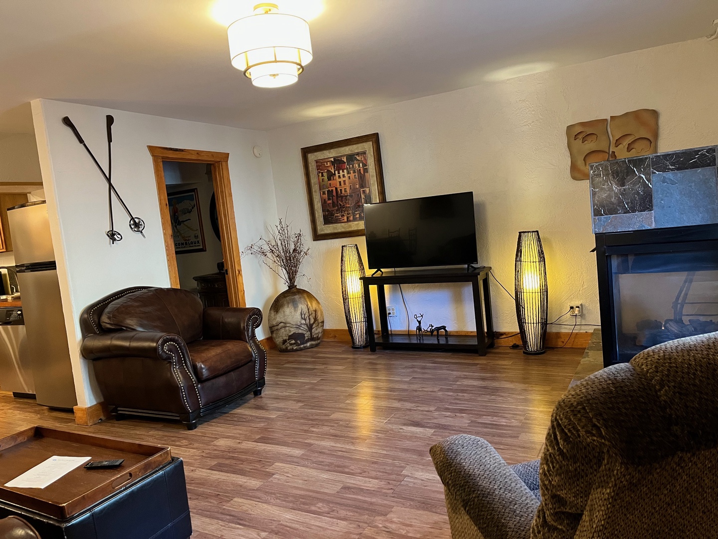 Ski-In-Ski-Out Condo at Taos just off the slopes. Large living area, with 40 smart TV with leather sofa seating and new recliner makes it easy for everyone to get comfortable. Family time, or us-time, you'll make yourself right at home. Large living area with three sided fireplace, leather furnishings and wood floors. 2 bedrooms, one with bunks. Snow Bear is lucky to be one of the few locations to have ski in ski out on the lower front side of the resort, just a short slide on the ski-out trail or quick hike down the road to the Children's Ski school - Rio Hondo Learning Center will get you on the Rueggli beginner lift to the base of lift 1, or the enclosed gondola to the Base area which drops guests at the top of Sutton Place. Vail 1 is a wonderful location featuring a fully equipped kitchen, comfortable beds and one full bathroom.